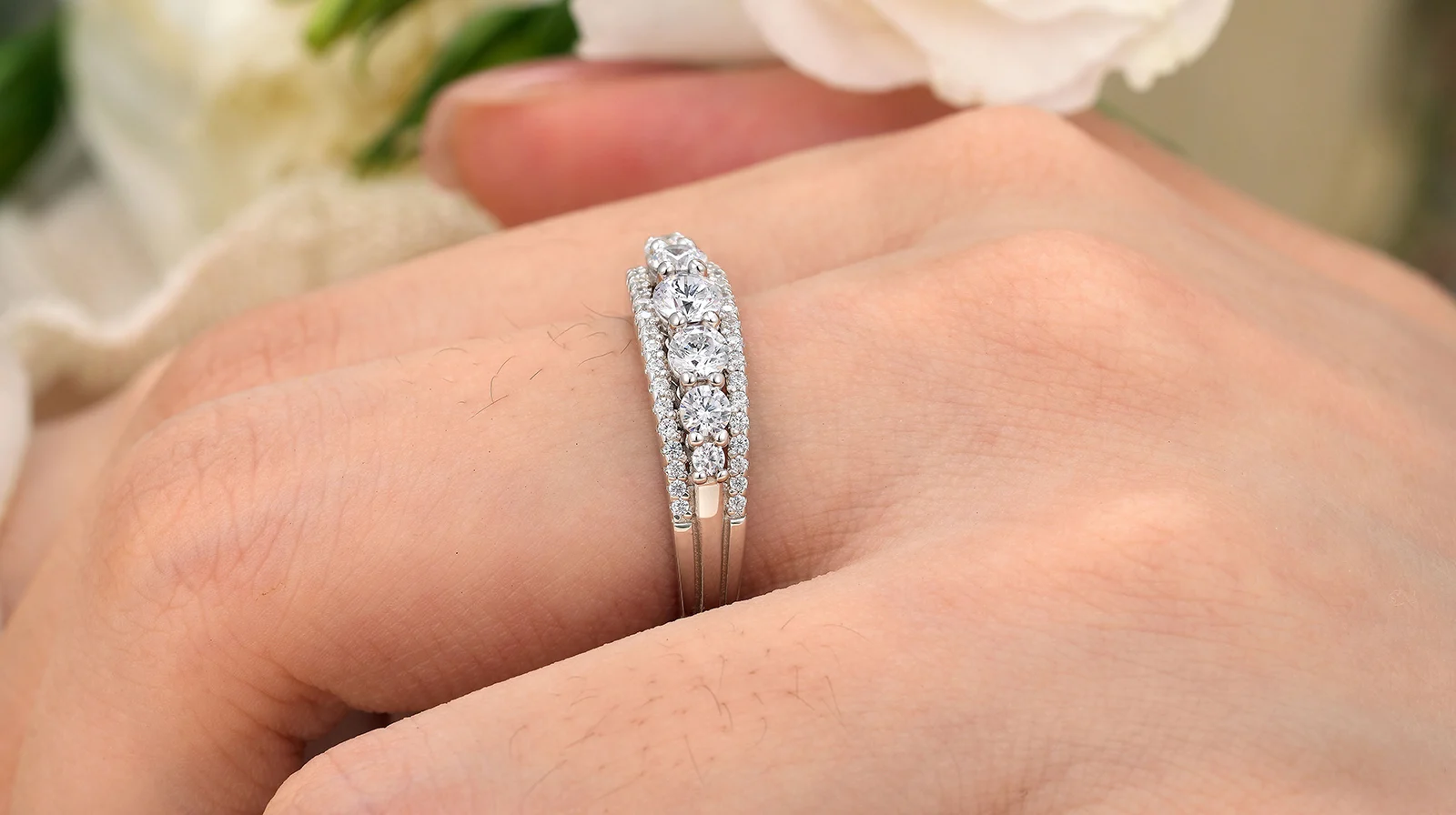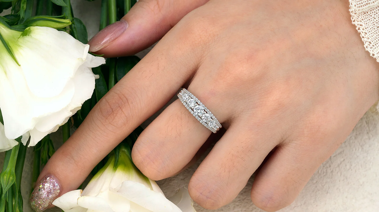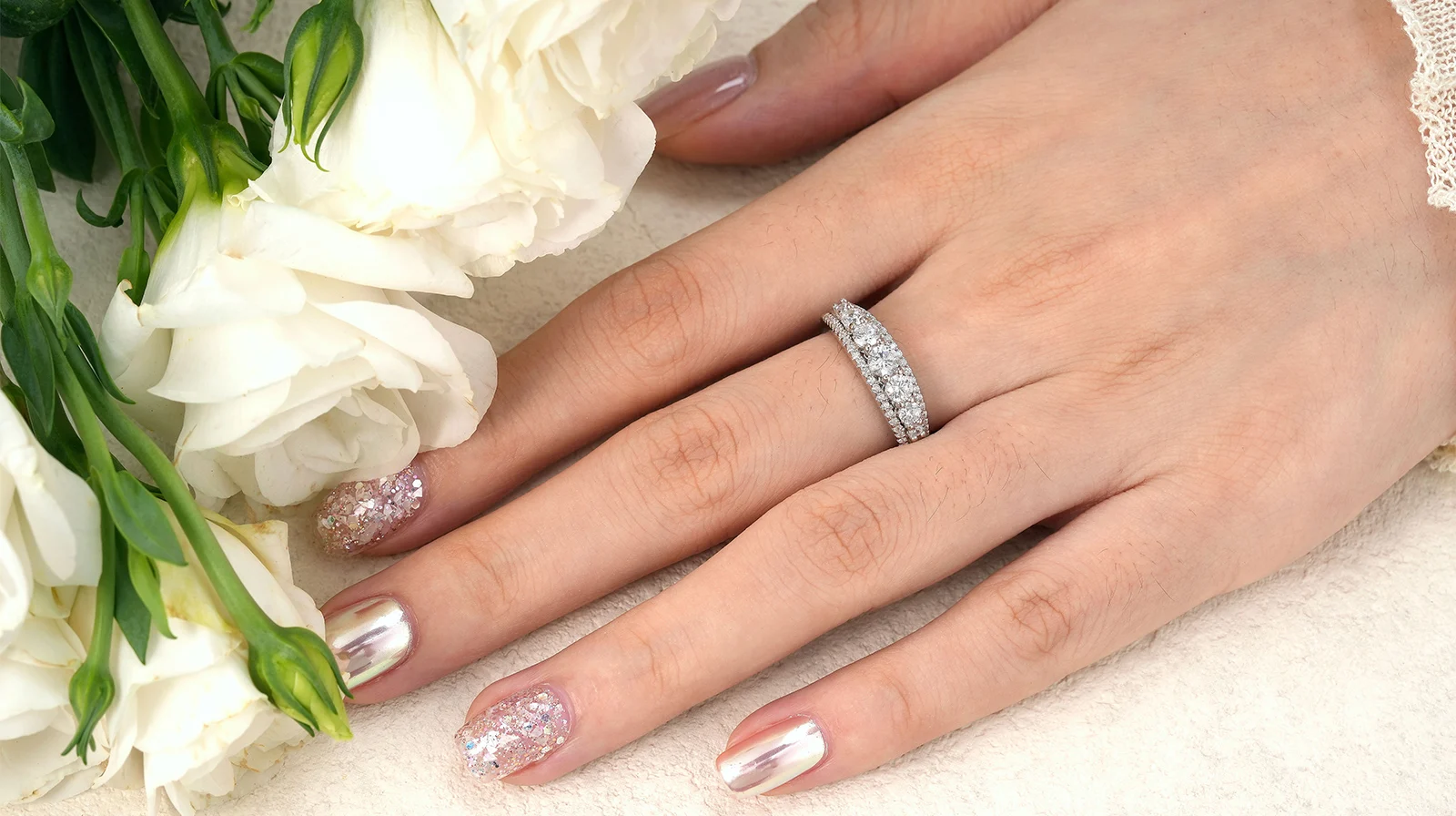 • The wedding band features an band ring surrounded by 45pcs brilliant white AAAAA cz down the sides. Top quality stones display amazing enriched clarity just like real diamond!
