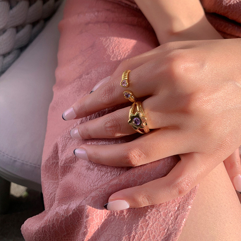 Fleepmart Adjustable 18k Real Gold Plated Purple Stone Flower Opening Rings for Women Design Finger Rings Female Texture bague femme