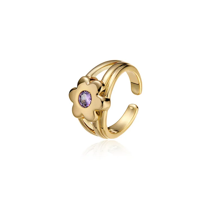 Fleepmart Adjustable 18k Real Gold Plated Purple Stone Flower Opening Rings for Women Design Finger Rings Female Texture bague femme