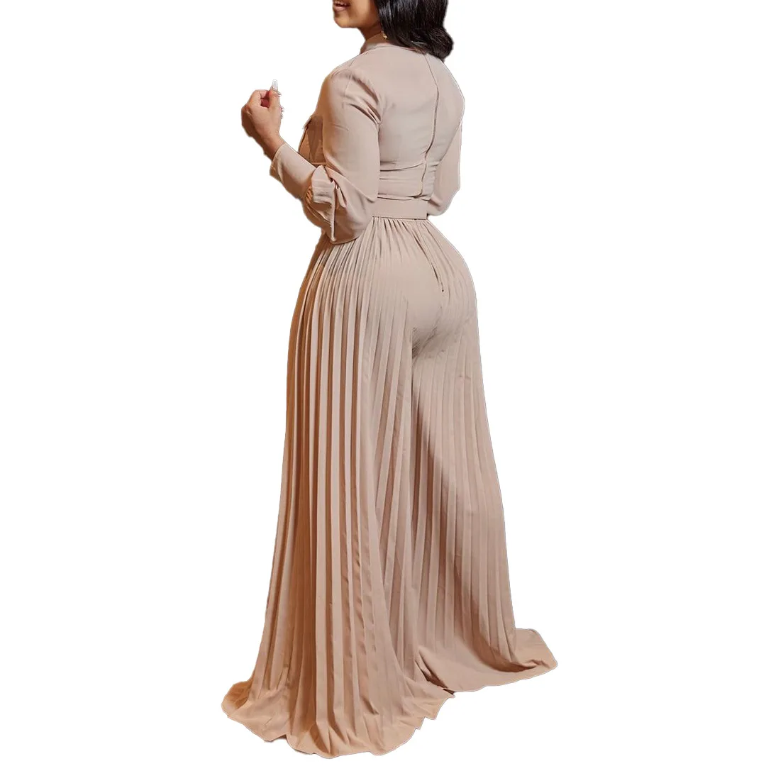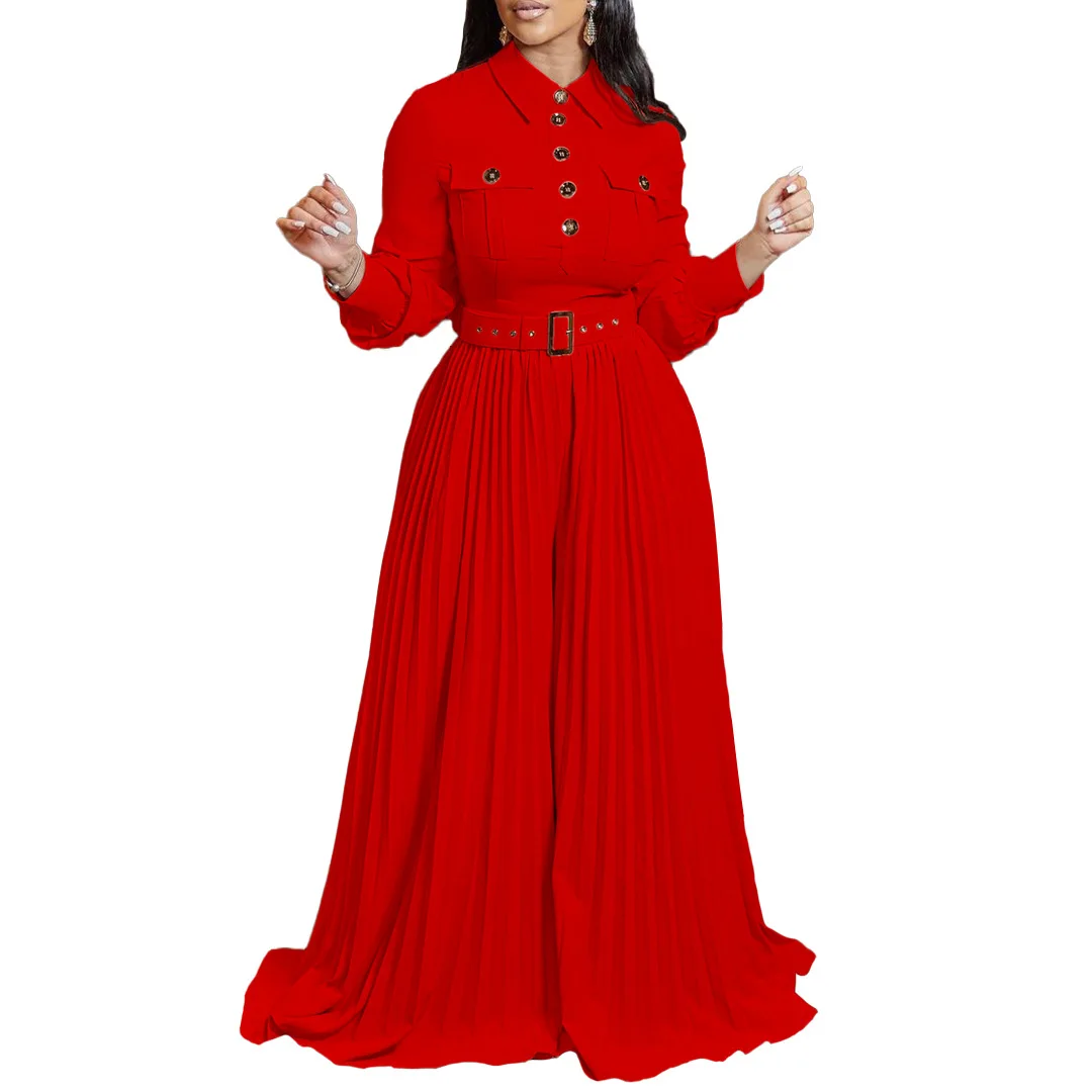 Fleepmart African Elegant Fashion Women Pleated Jumpsuits Long Sleeve Wide Leg Pants Rompers Party Office Outfits With Belt 2024