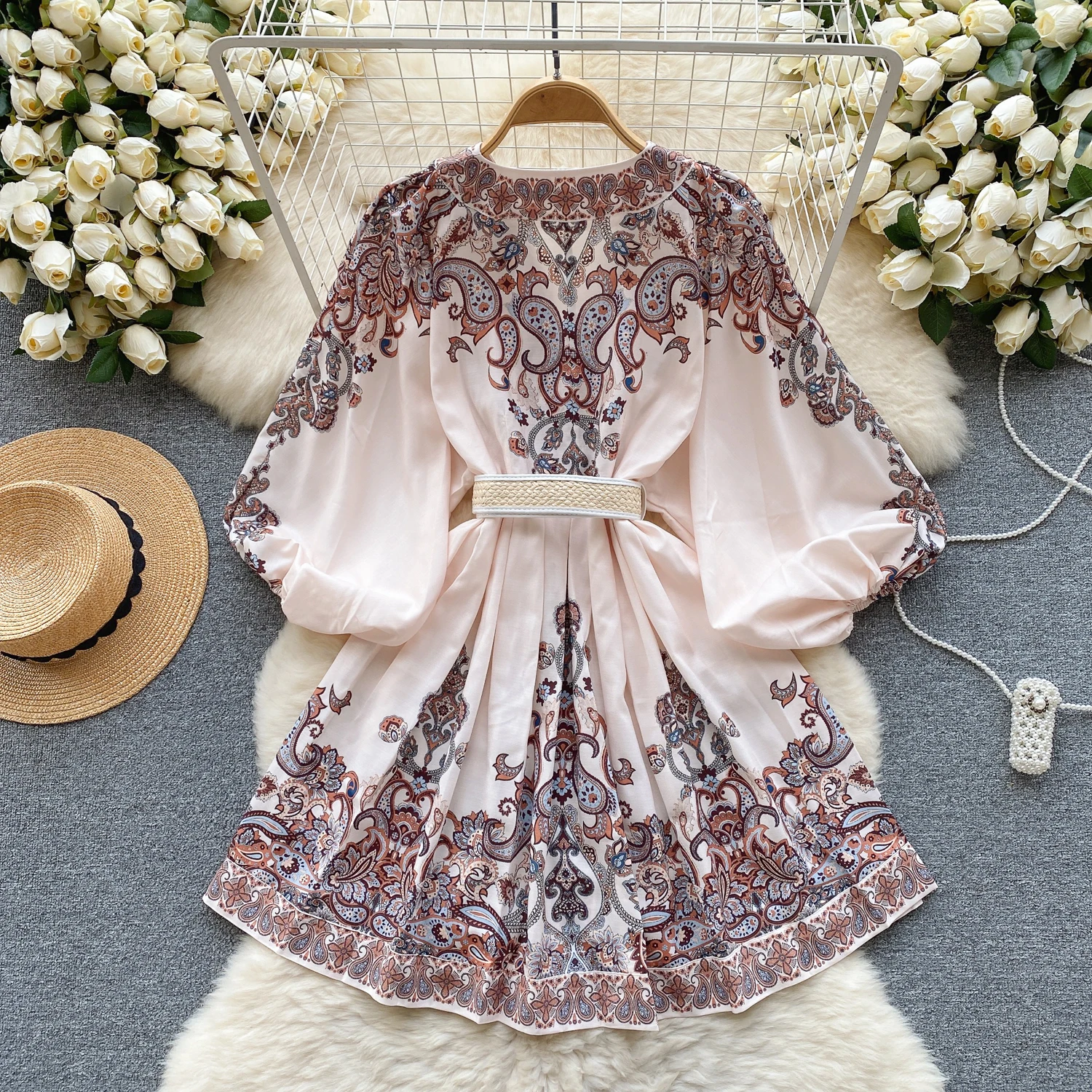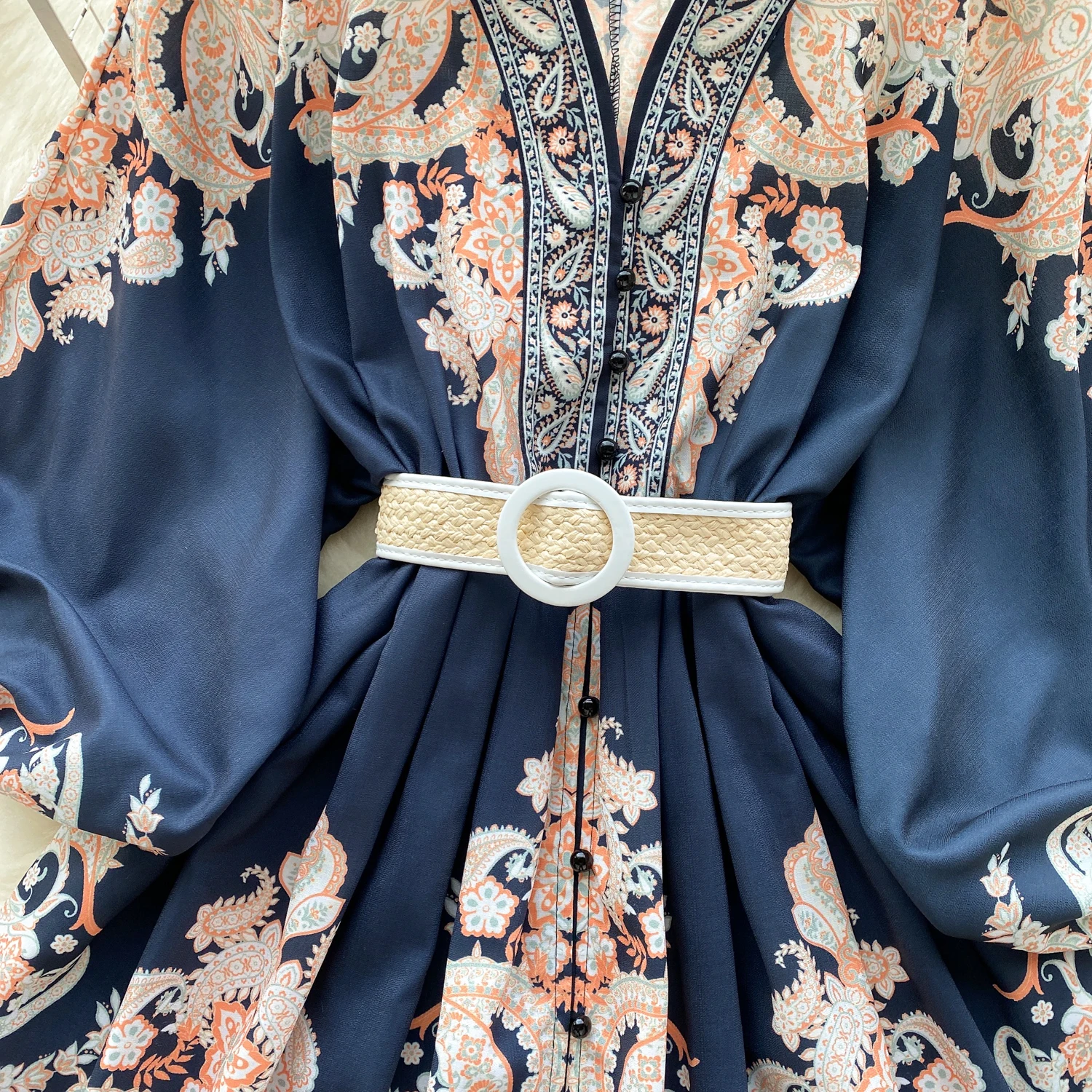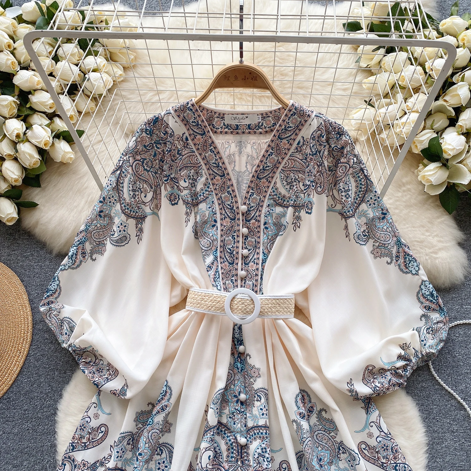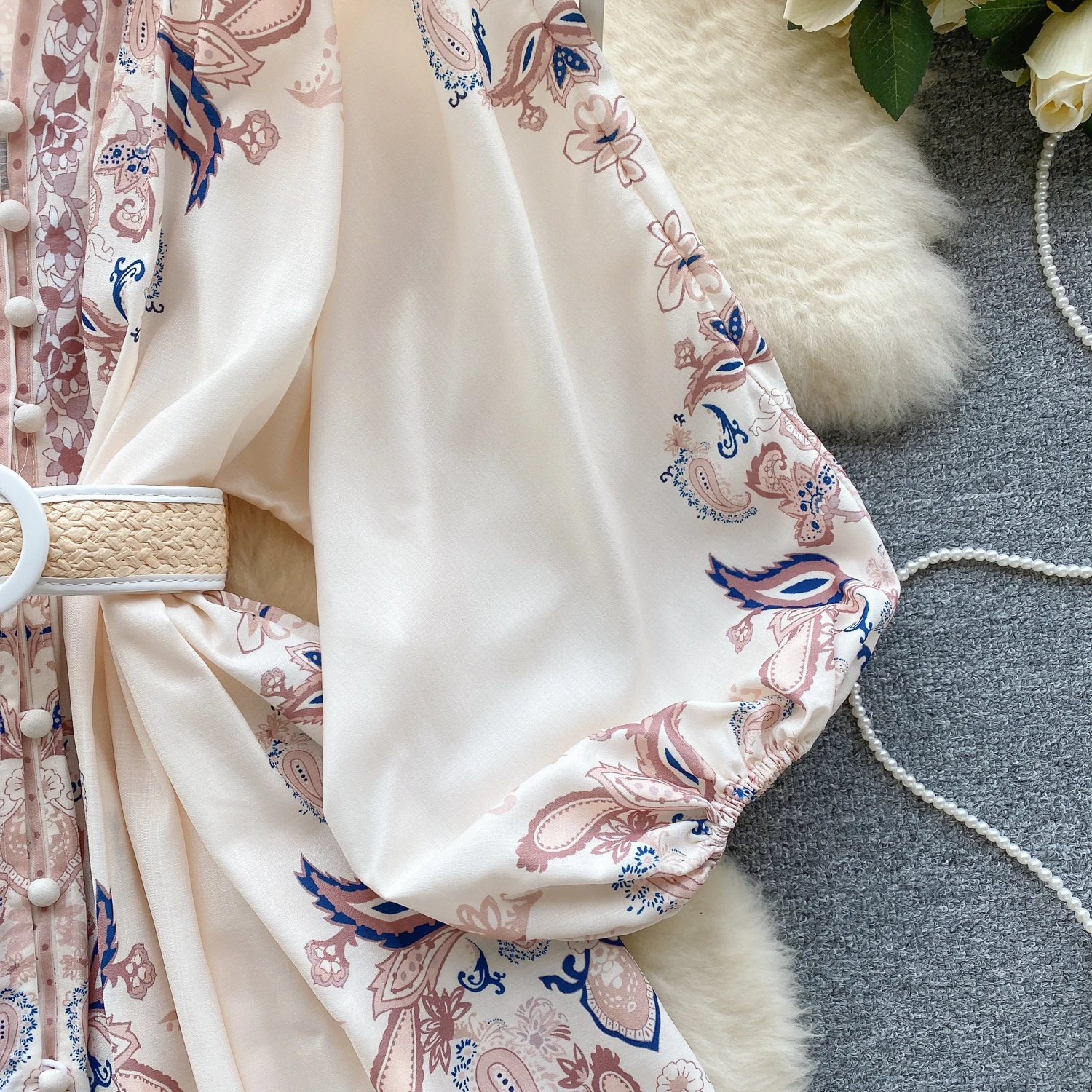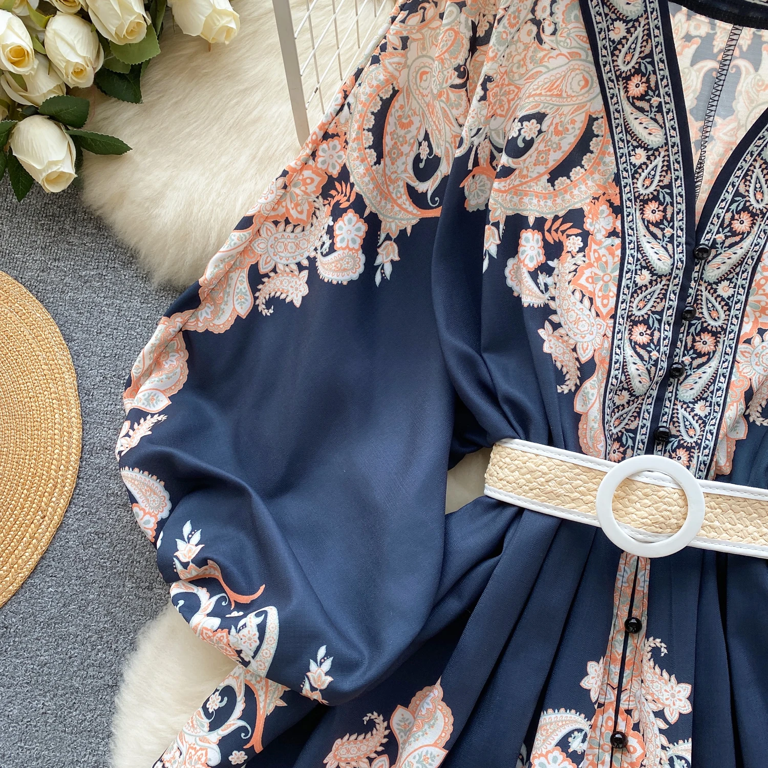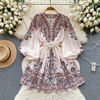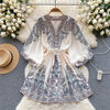 Fleepmart Autumn Elegant Floral Knee Length Dress for Women Vintage 3/4 Sleeve Cotton Waist Hem Dresses Female Vacation Traf New In 2023