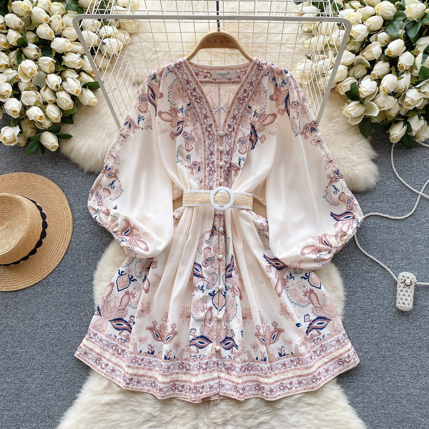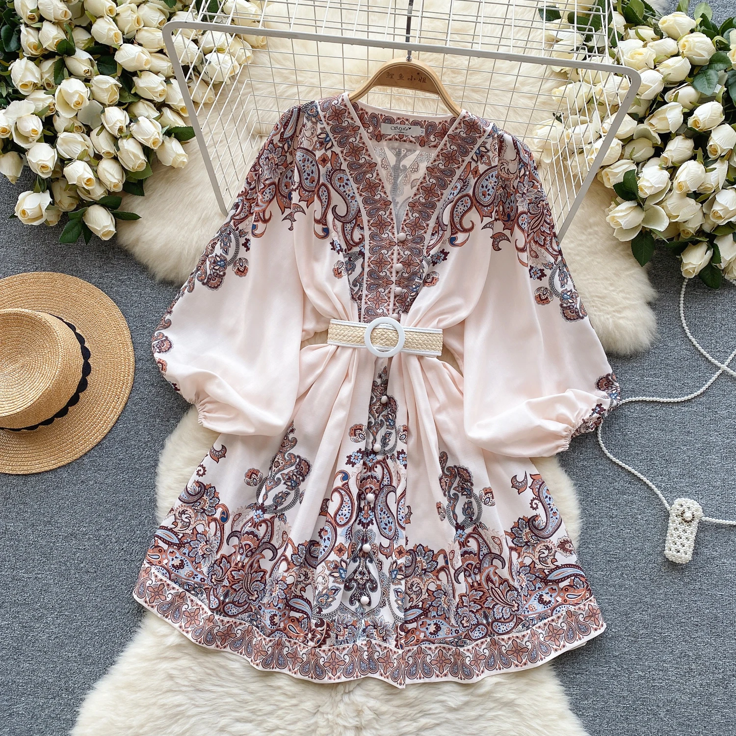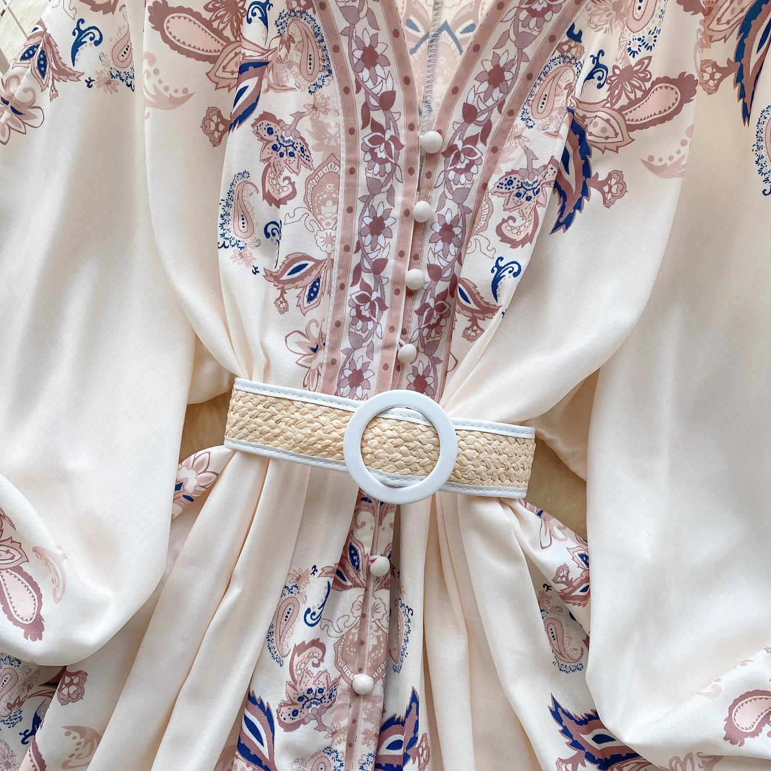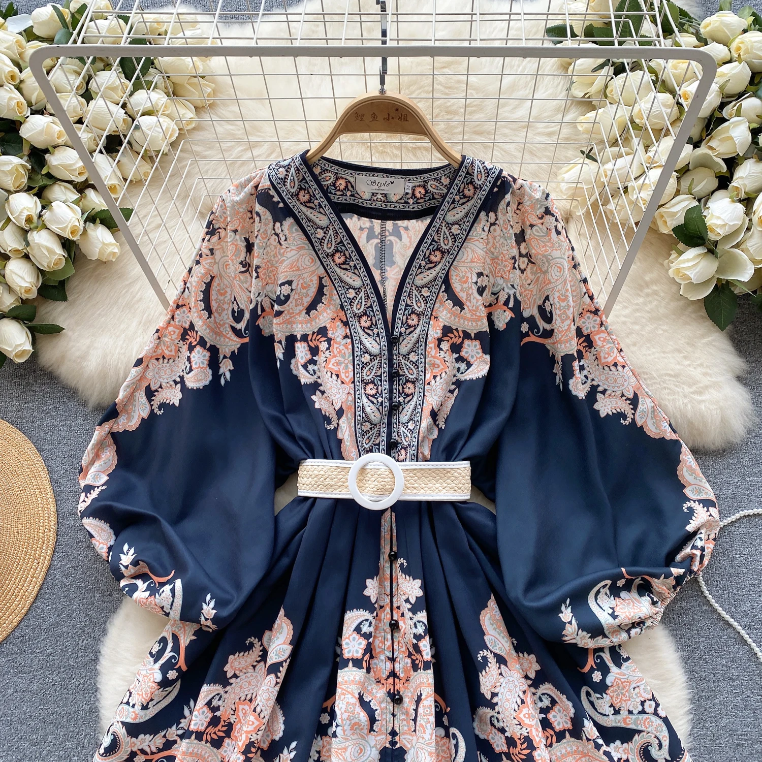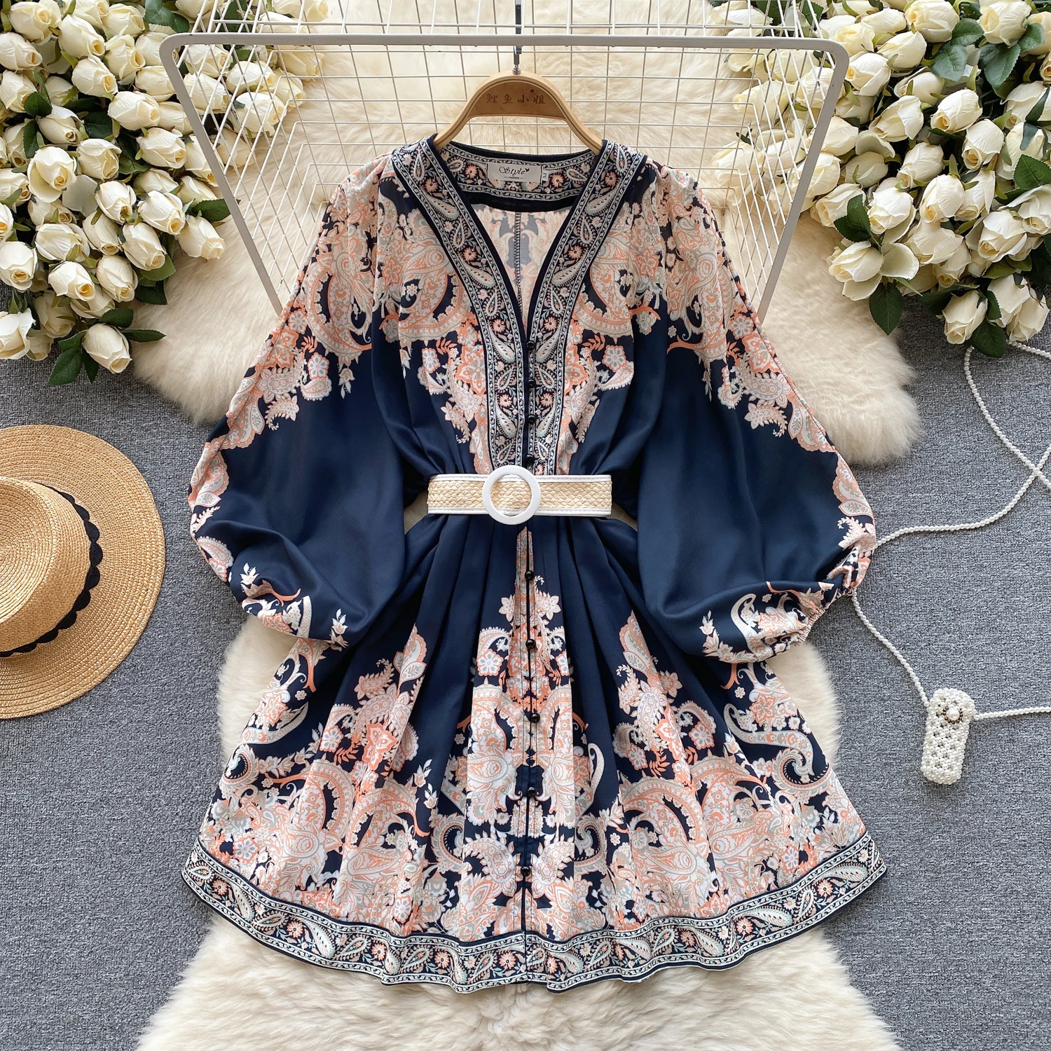 Fleepmart Autumn Elegant Floral Knee Length Dress for Women Vintage 3/4 Sleeve Cotton Waist Hem Dresses Female Vacation Traf New In 2023