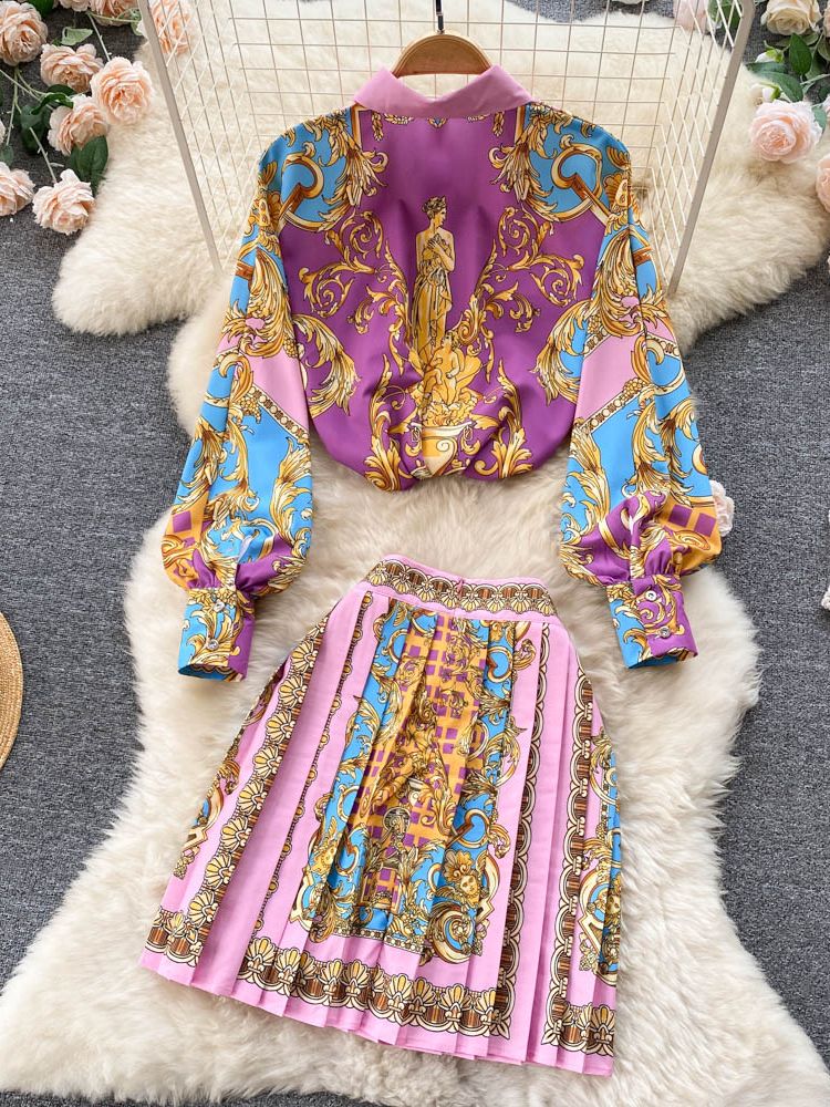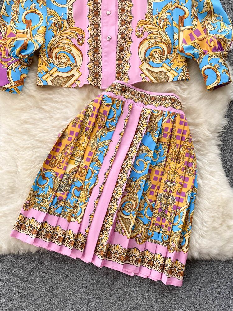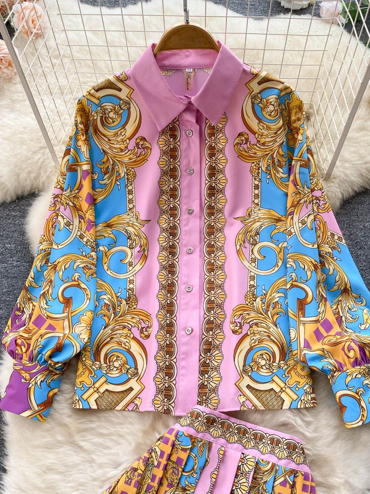 Fleepmart Autumn Elegant Skirts Suit Women’s Puff Sleeve Beading Lapel White Shirt Top+Flower Print Mesh Ball Gown Belt Skirts 2 Piece Set