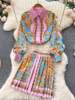 Fleepmart Autumn Elegant Skirts Suit Women’s Puff Sleeve Beading Lapel White Shirt Top+Flower Print Mesh Ball Gown Belt Skirts 2 Piece Set