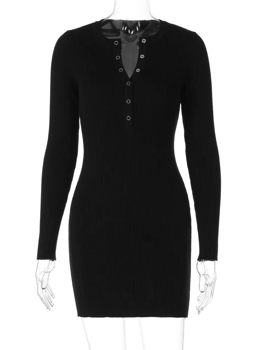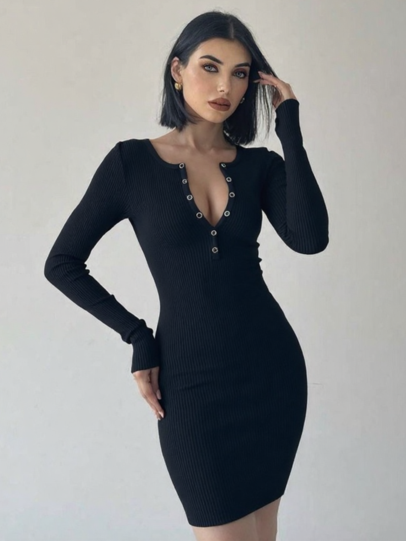 Fleepmart Autumn Fashion Sexy V-Neck Long Sleeve Bodycon Single Breasted Mini Dress Women’S Solid Casual Clothes Party Club Outfit