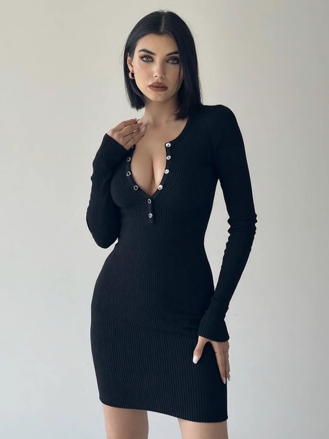 Fleepmart Autumn Fashion Sexy V-Neck Long Sleeve Bodycon Single Breasted Mini Dress Women’S Solid Casual Clothes Party Club Outfit