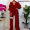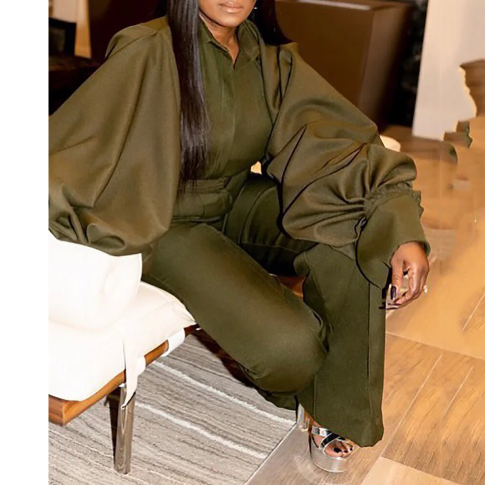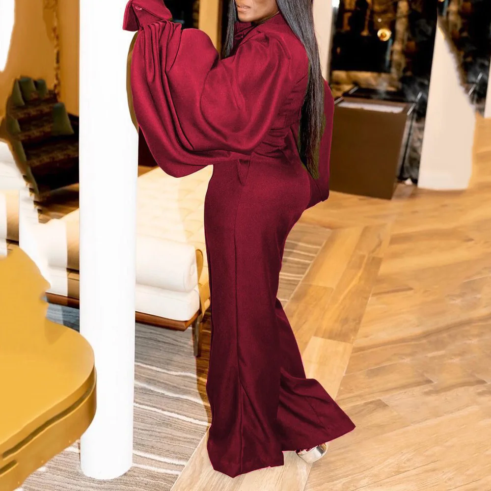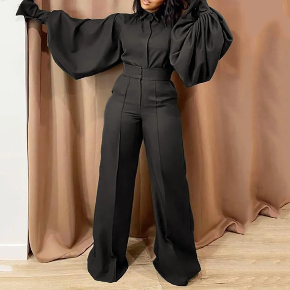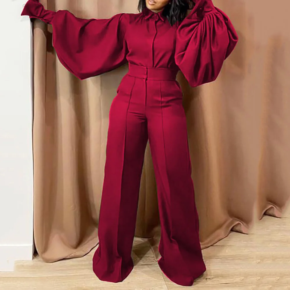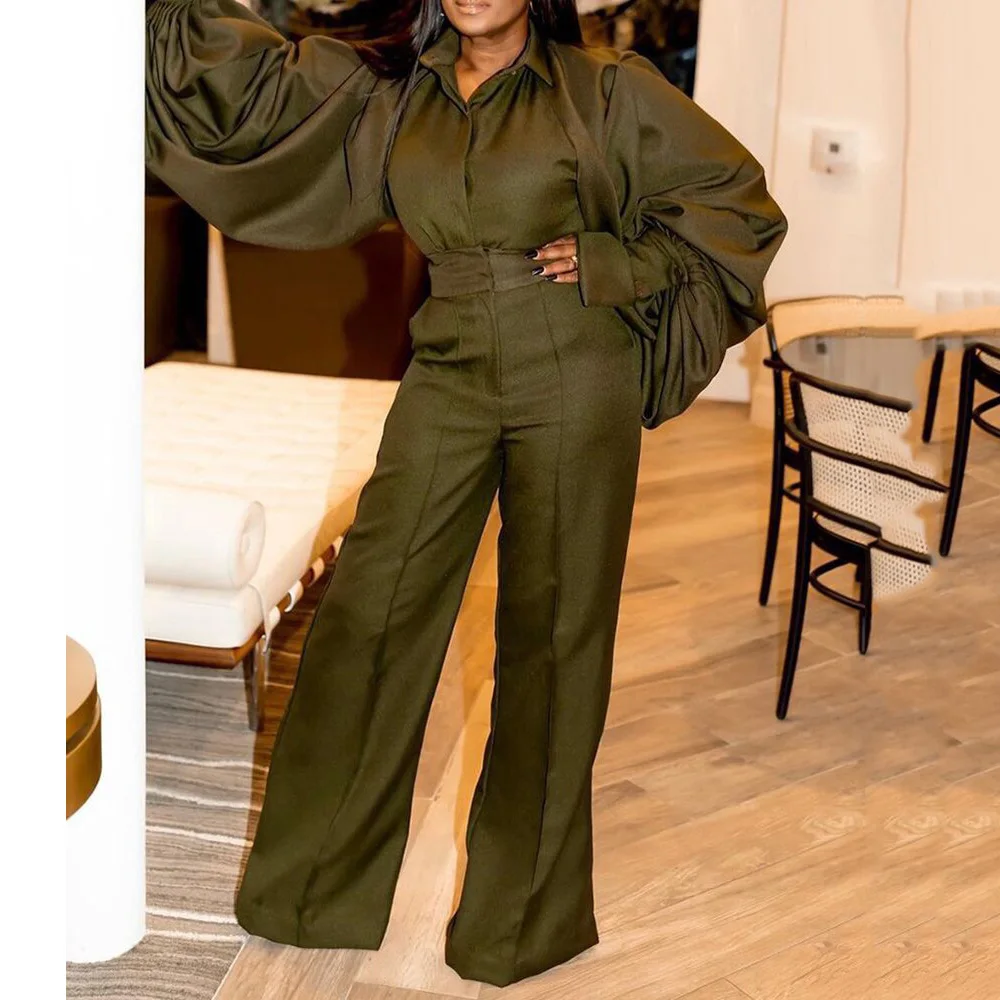 Fleepmart Autumn New Jumpsuits for Ladies Full Lantern Sleeve High Waisted Turn Down Collar Fashion Elegant Long Rompers & Jumpsuits Hot