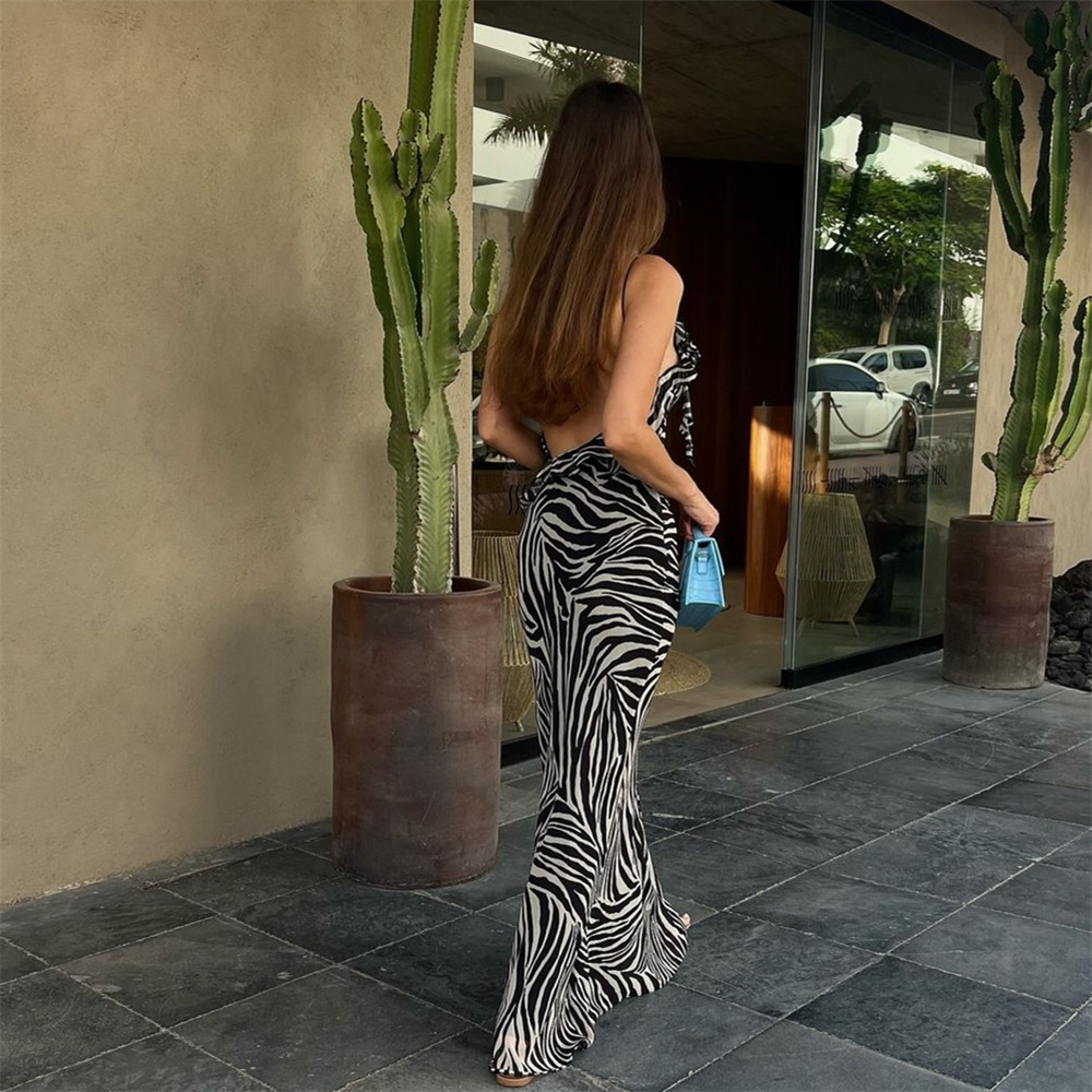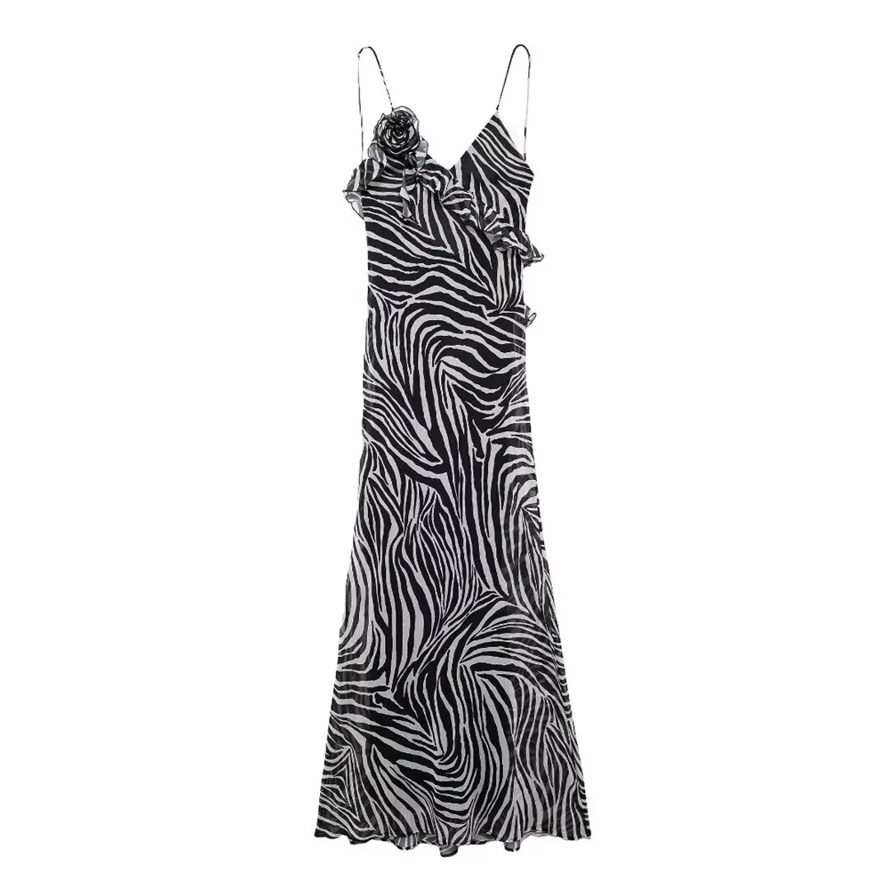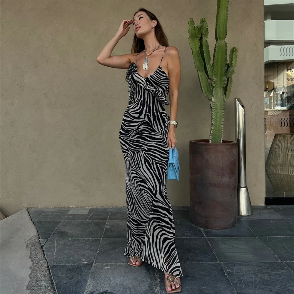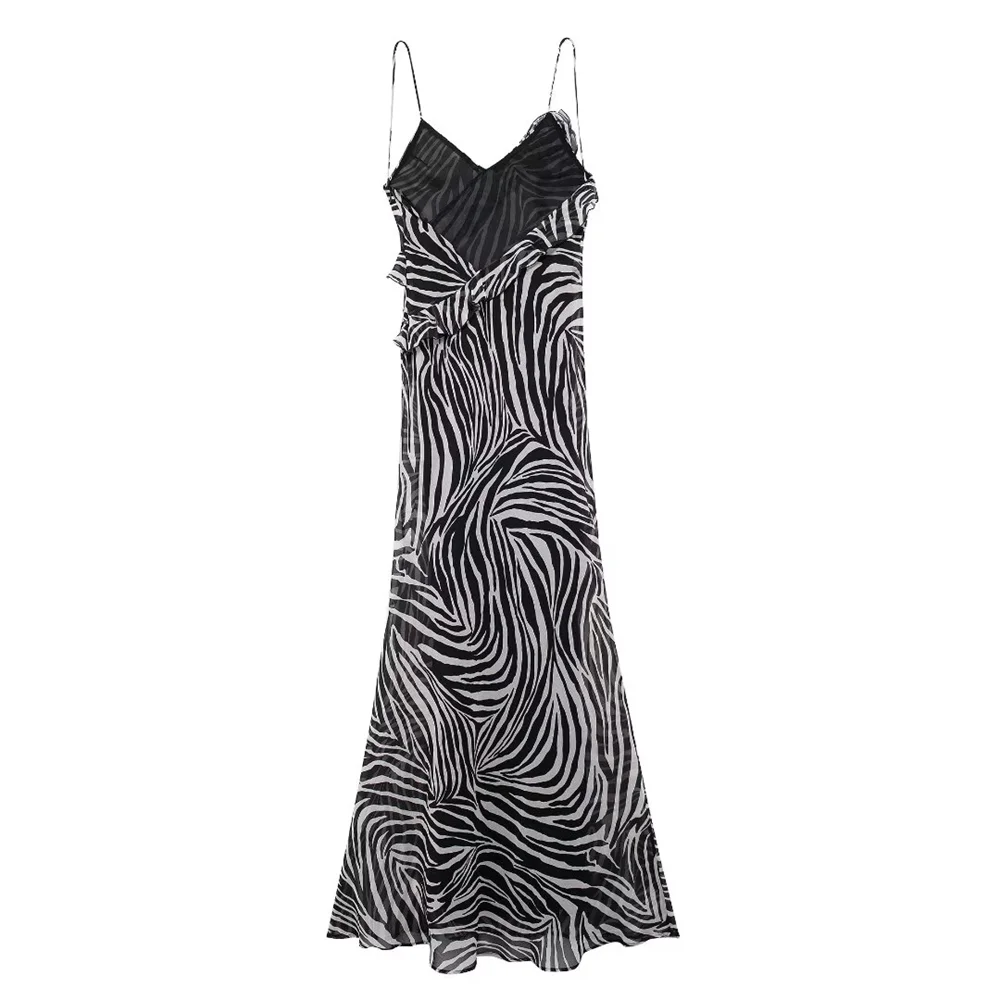 Fleepmart autumn new women’s fashionable slim fit long ruffle animal print backless suspender dress