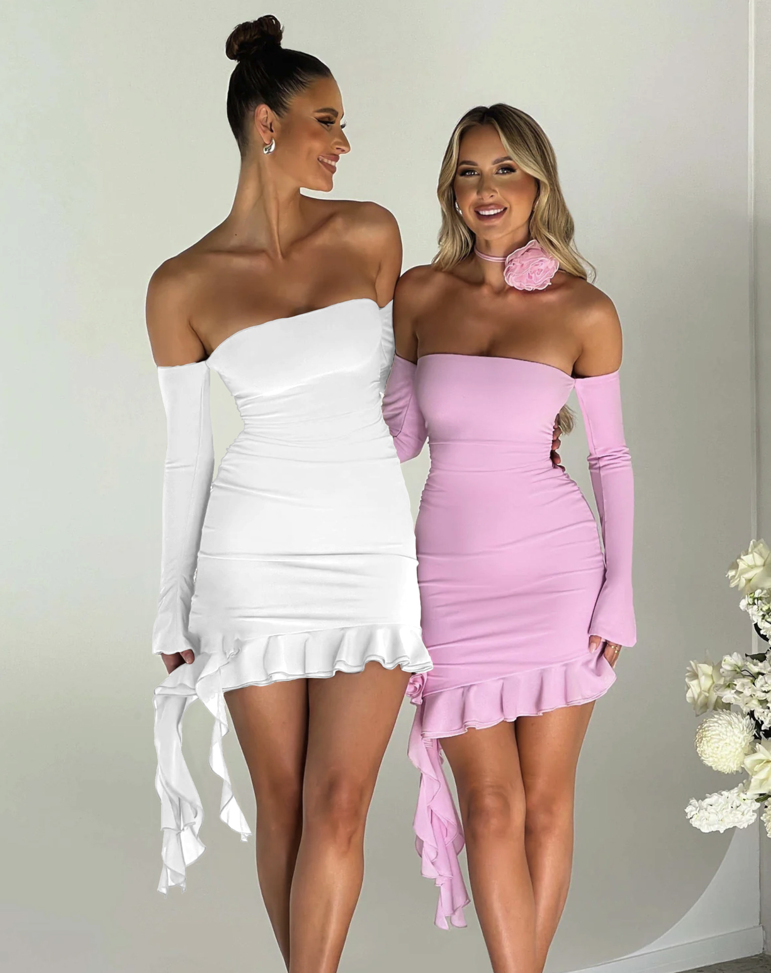 Fleepmart Autumn Sexy Off-Shoulder Tube Top Dress For Women Long Sleeve Slim Ruffles Dress Solid Color Strapless Dresses