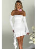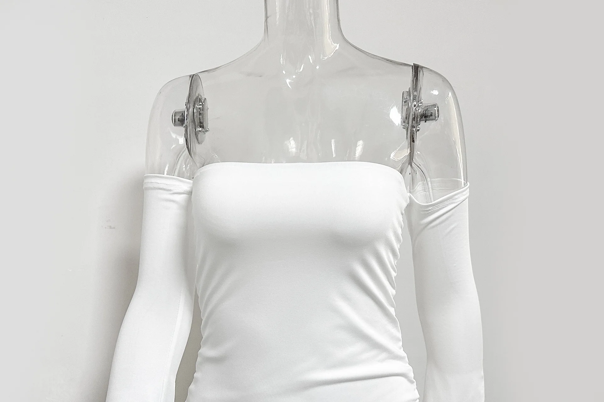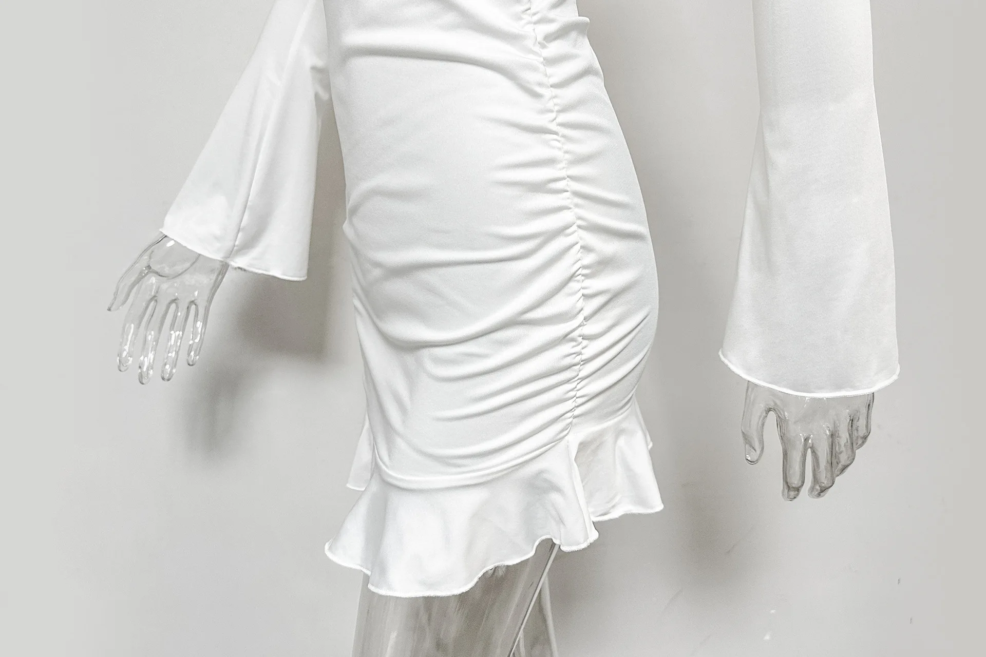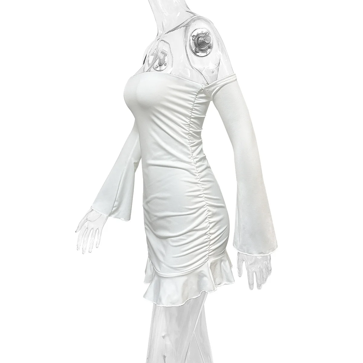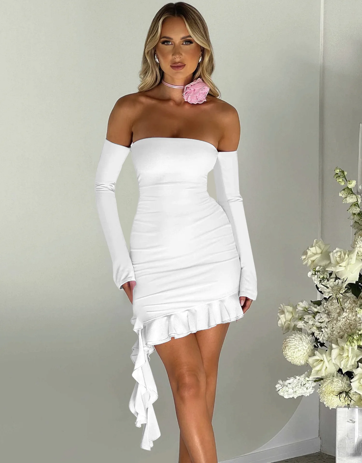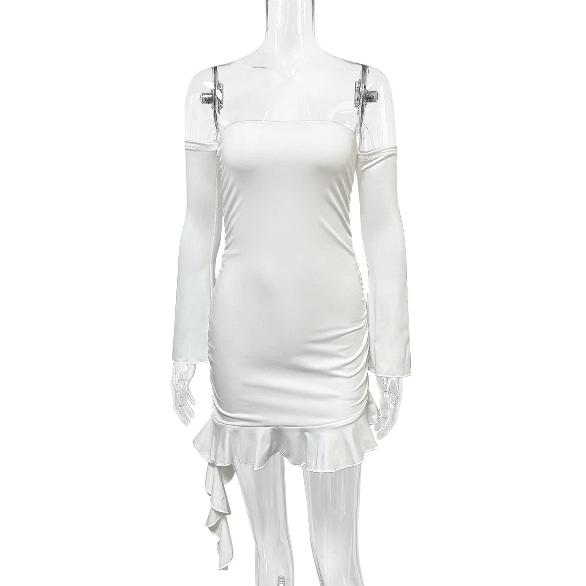 Fleepmart Autumn Sexy Off-Shoulder Tube Top Dress For Women Long Sleeve Slim Ruffles Dress Solid Color Strapless Dresses