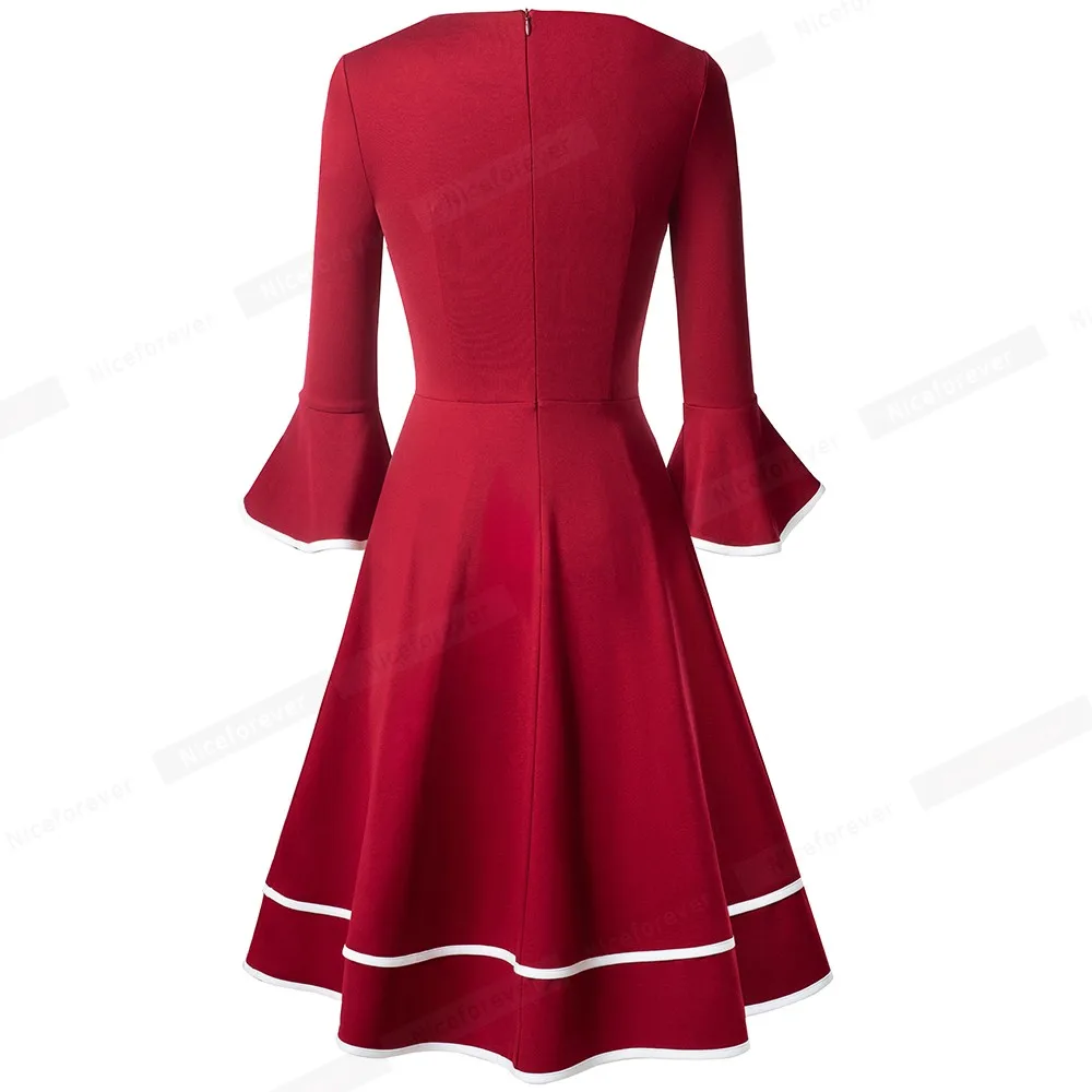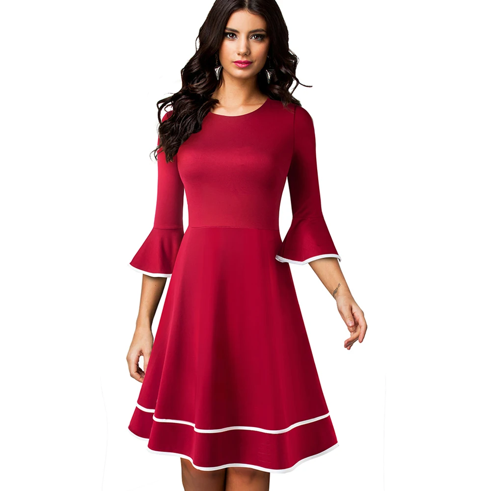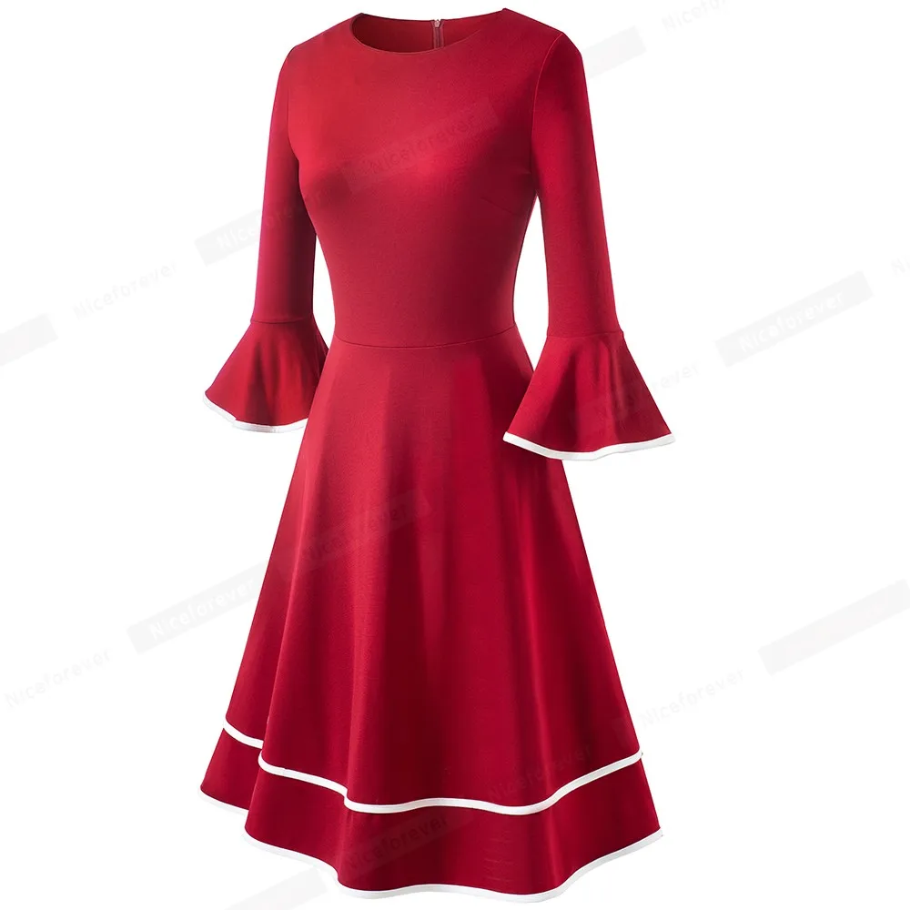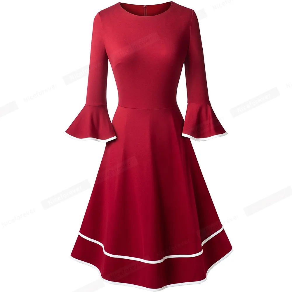 fleepmart Autumn Solid Color with Flare Sleeve Retro A-Line Dresses Christmas Party Swing Women Dress