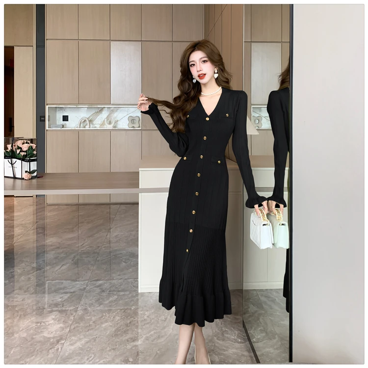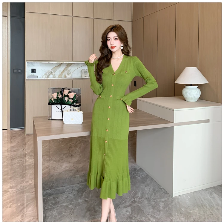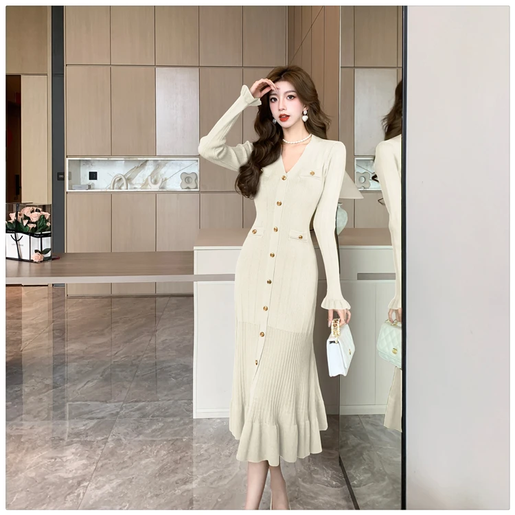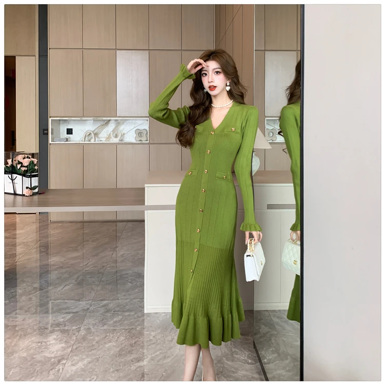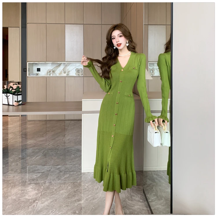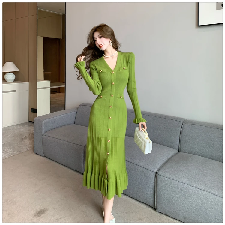 Fleepmart Autumn Solid Knitted Dresses for Women Single Breasted Chic Flared Sleeve Ruffles Hem Casual 2025 Female Office Elegant Robes