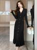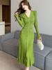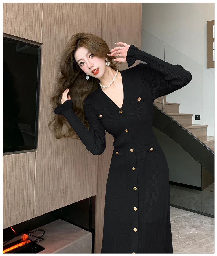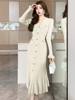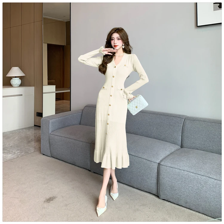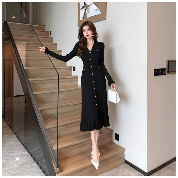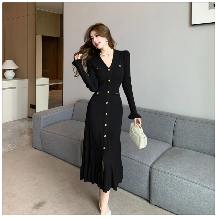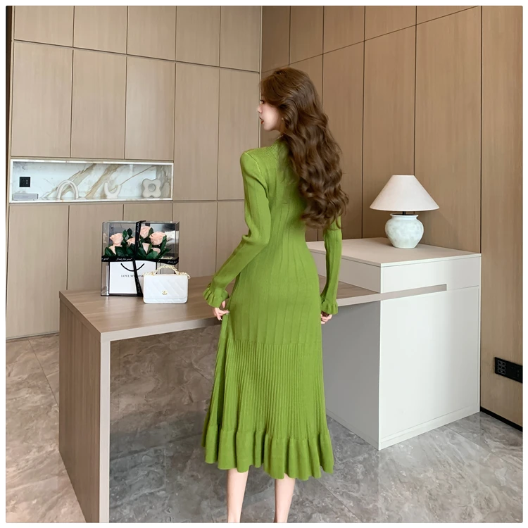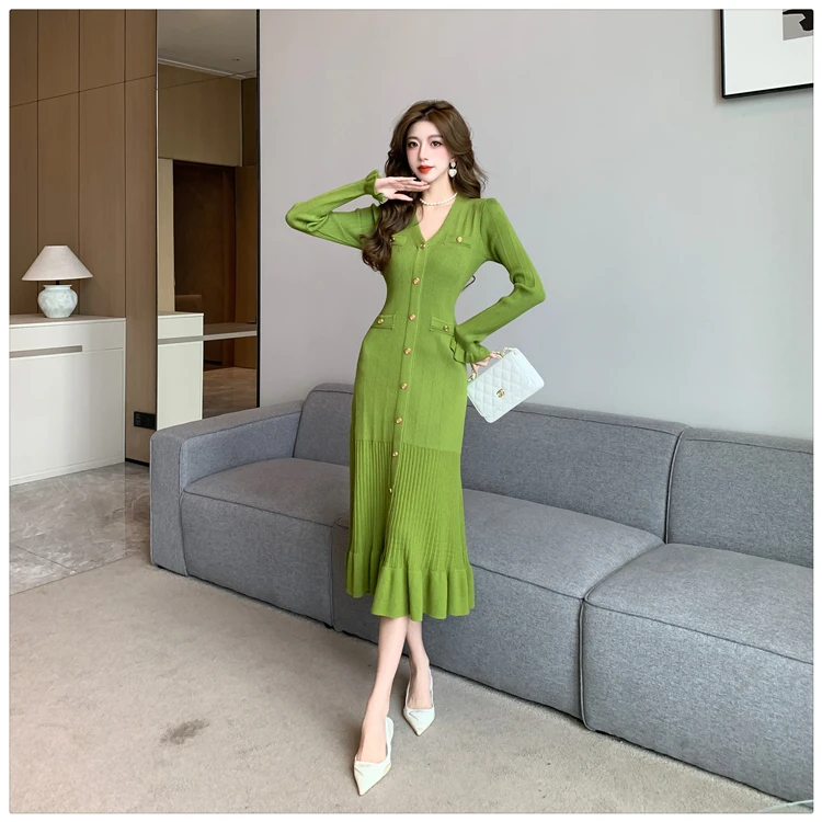 Fleepmart Autumn Solid Knitted Dresses for Women Single Breasted Chic Flared Sleeve Ruffles Hem Casual 2025 Female Office Elegant Robes