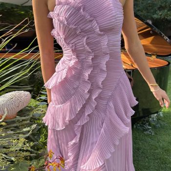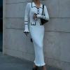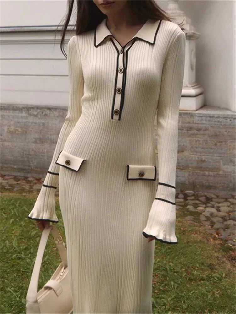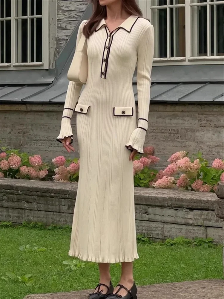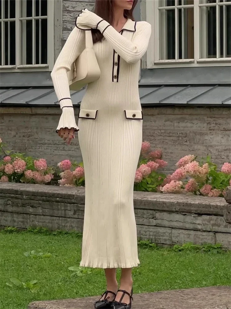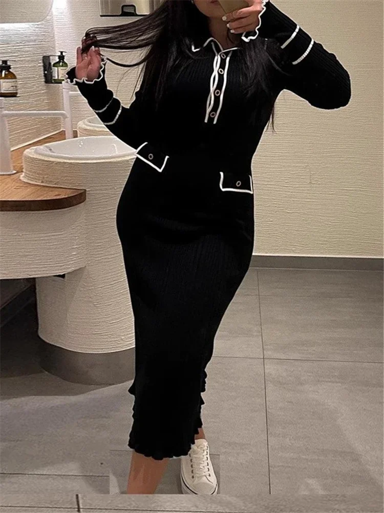 Fleepmart Autumn Winter Elegant Knitted Long Ruffles Dressres 2025 New High Waist Buttons Turn-down Collar Sweater Dresses Female