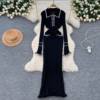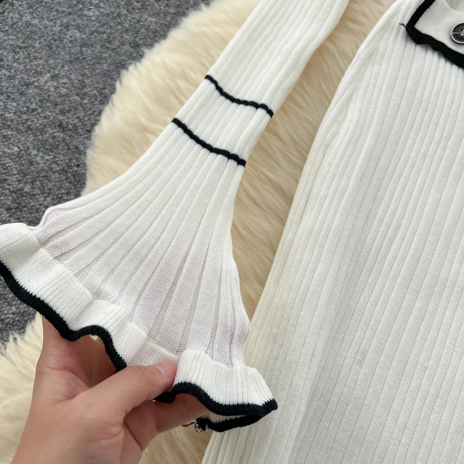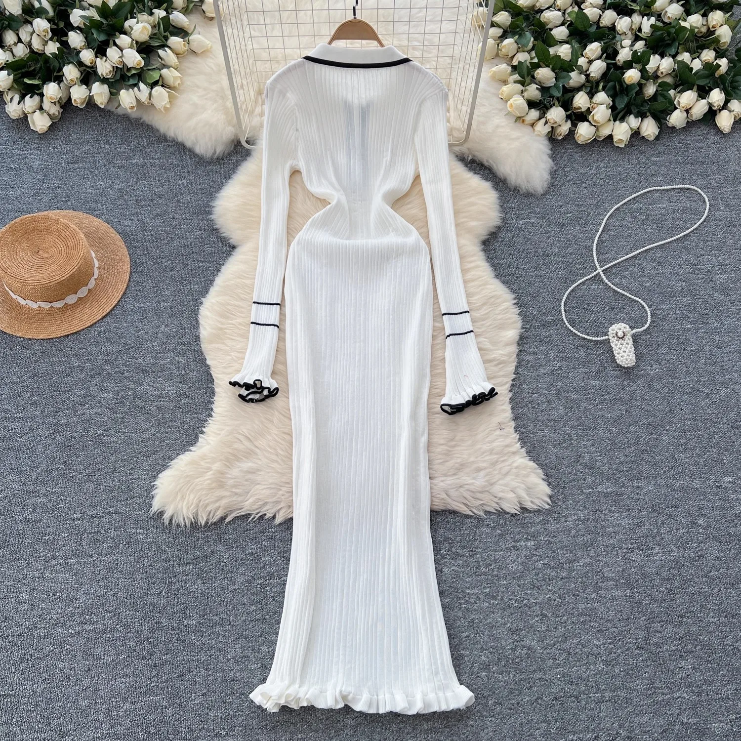Fleepmart Autumn Winter Vintage High Waist Knitted Ruffles Long Dressres 2025 New Buttons Turn-down Collar Sweater Dresses Female