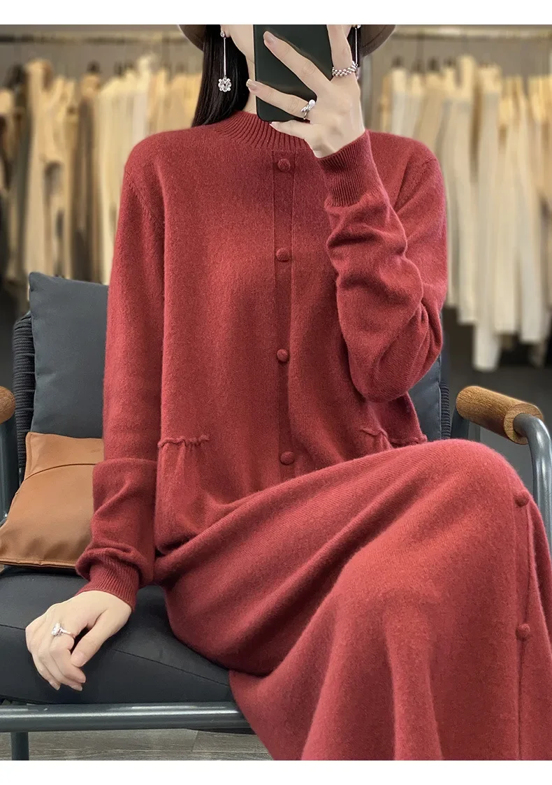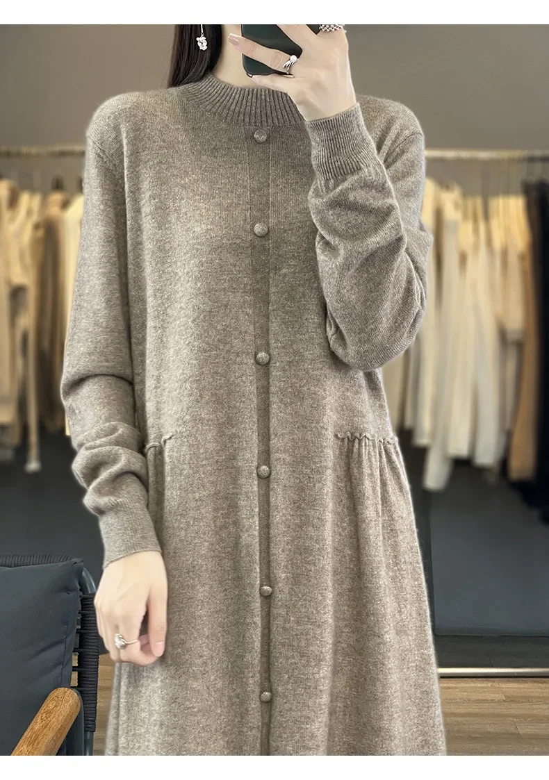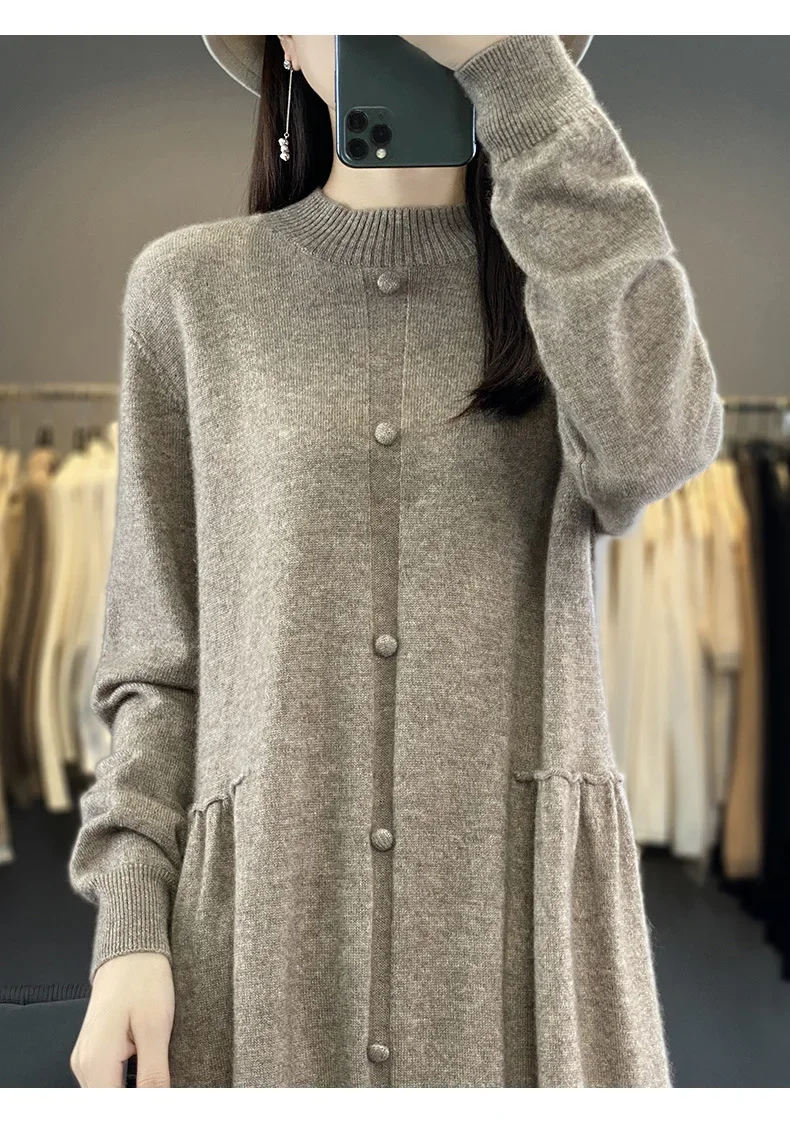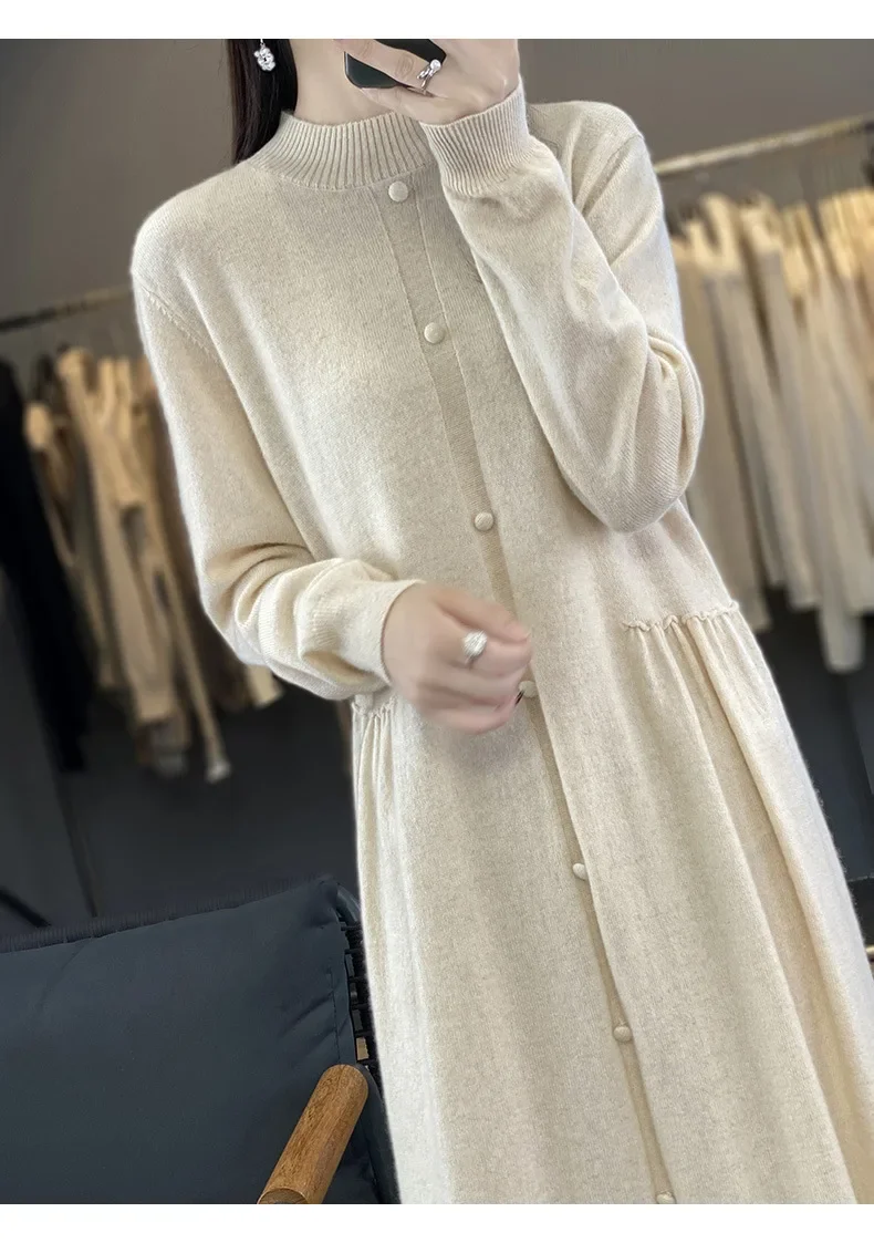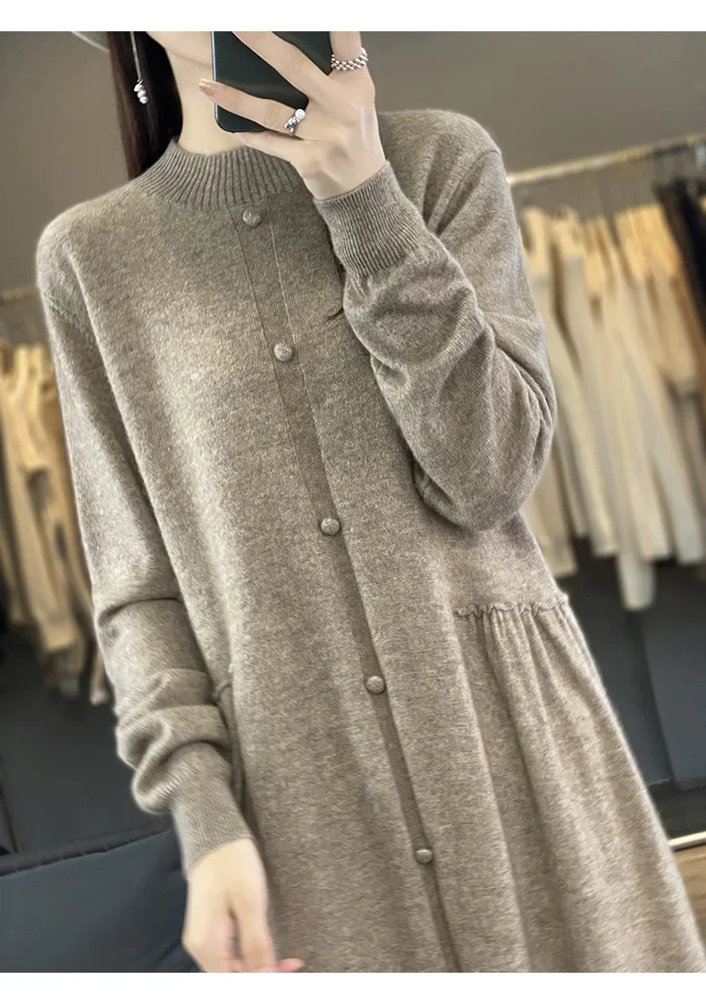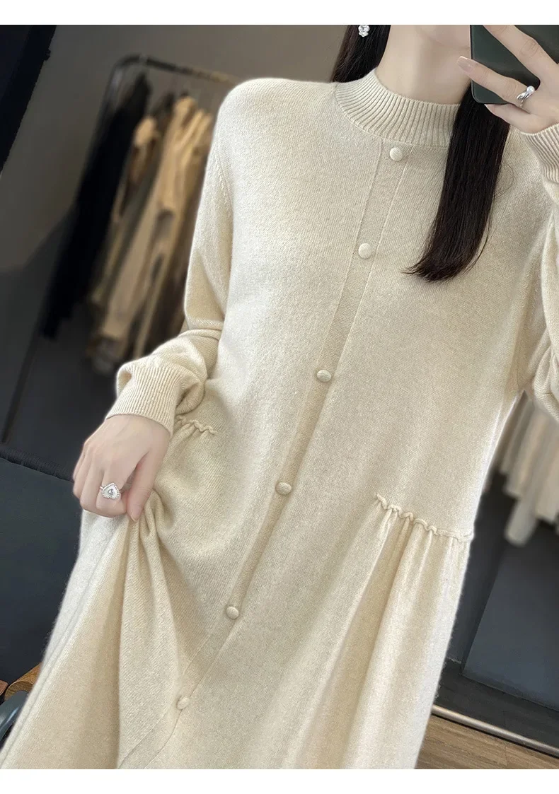 Fleepmart Autumn Winter Women’s Long Wool Dress Knee-Brushing Slimming Half-High Collar Pure Wool Base Skirt Fashionable Elegant