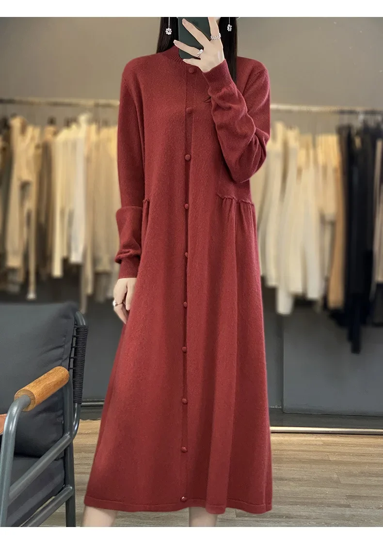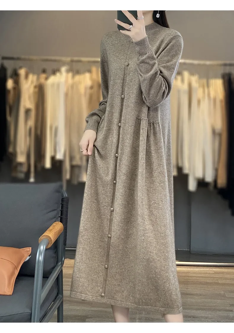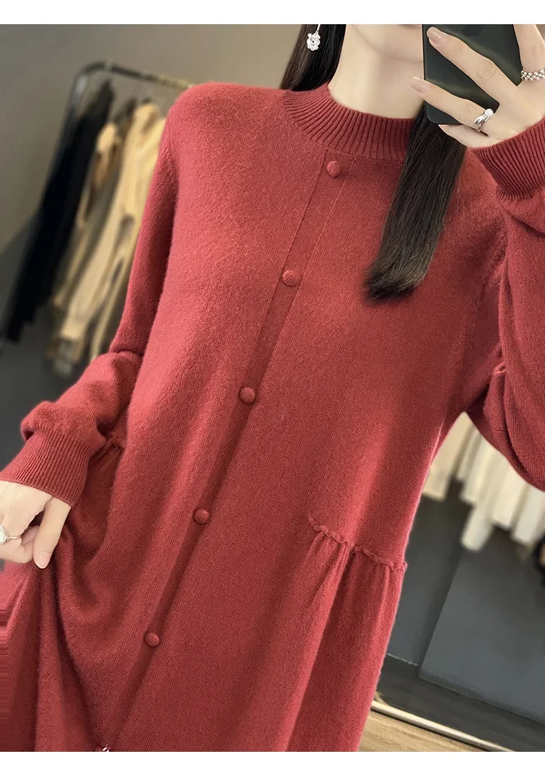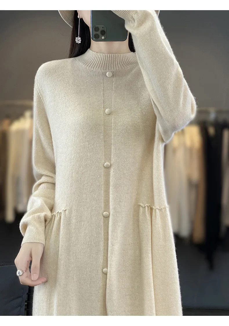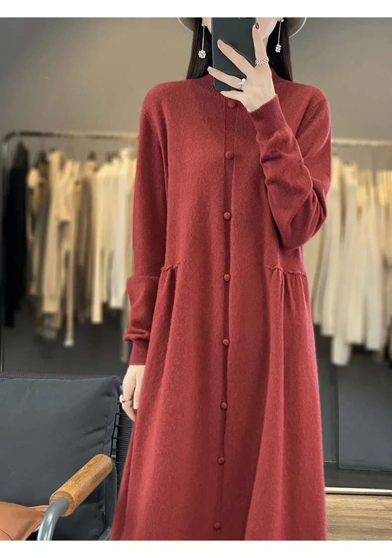 Fleepmart Autumn Winter Women’s Long Wool Dress Knee-Brushing Slimming Half-High Collar Pure Wool Base Skirt Fashionable Elegant