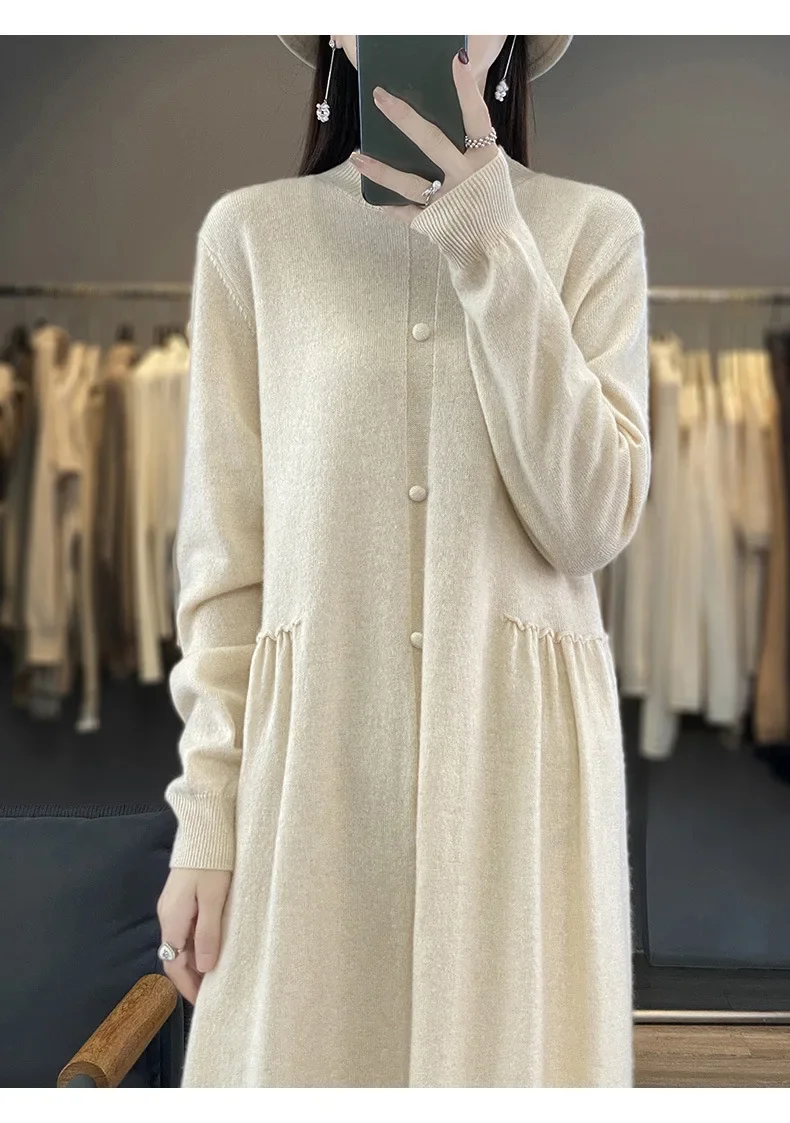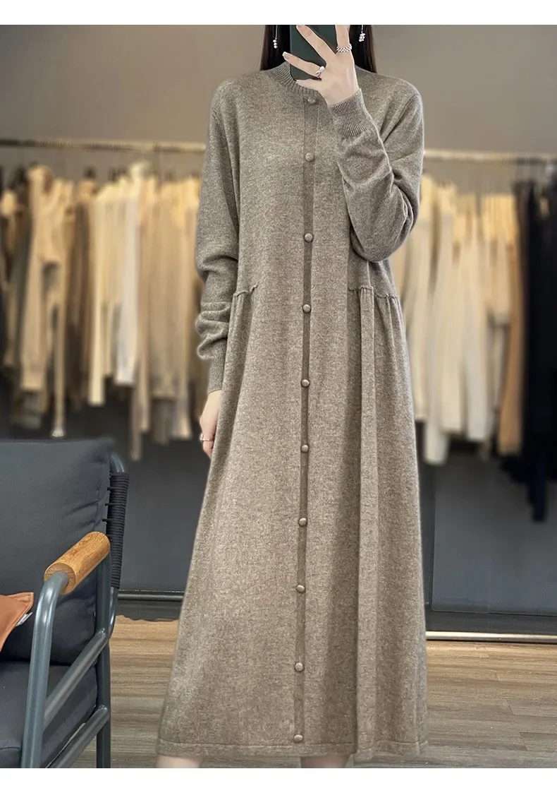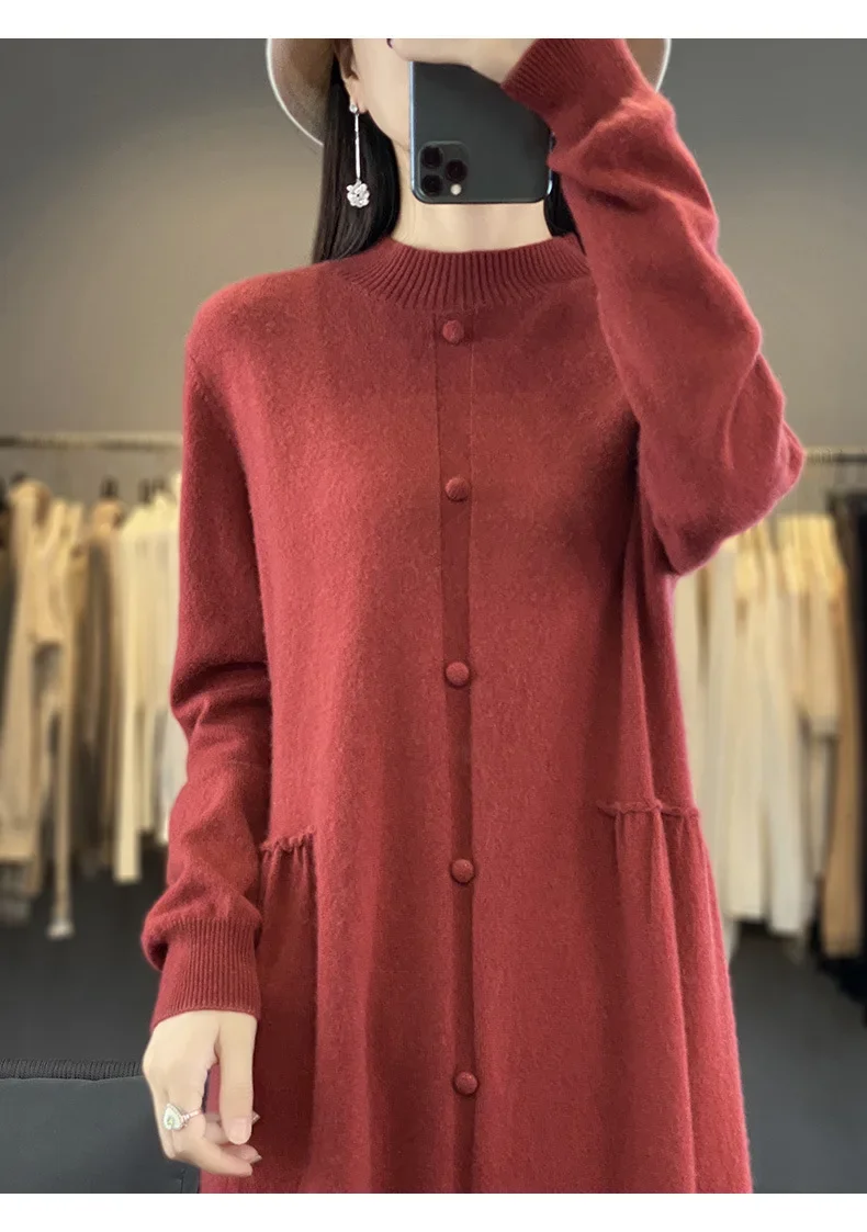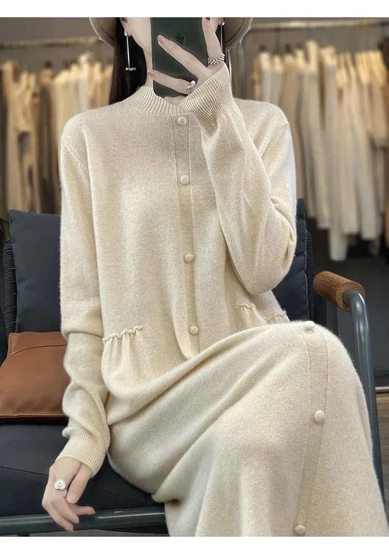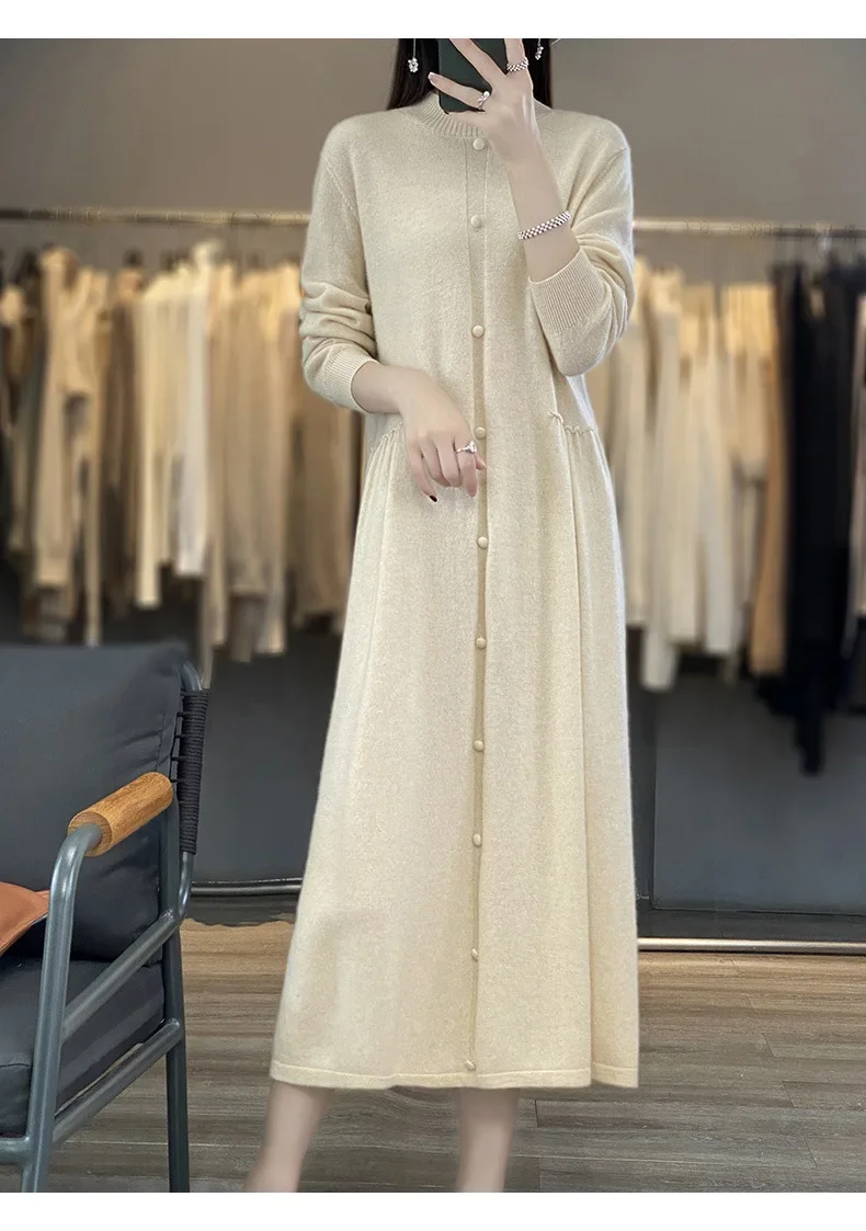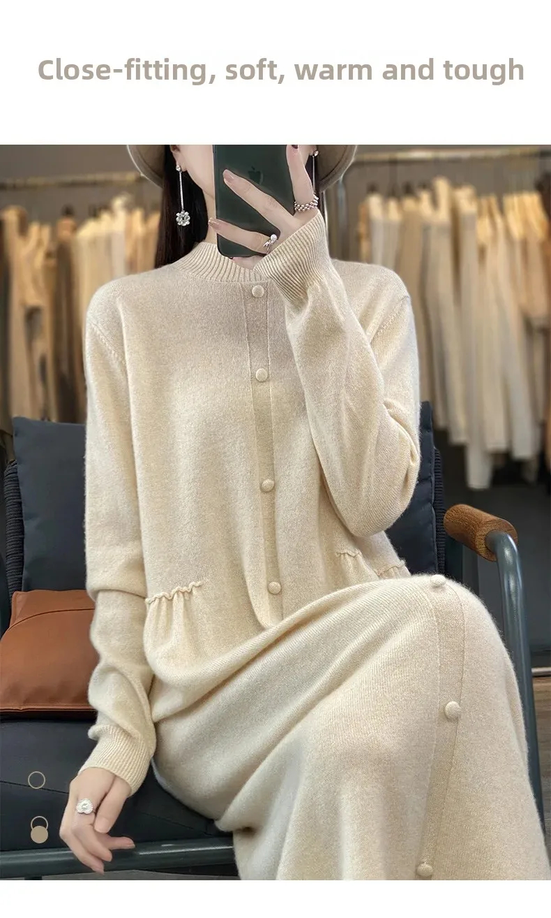 Fleepmart Autumn Winter Women’s Long Wool Dress Knee-Brushing Slimming Half-High Collar Pure Wool Base Skirt Fashionable Elegant