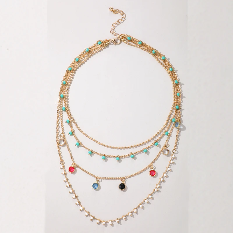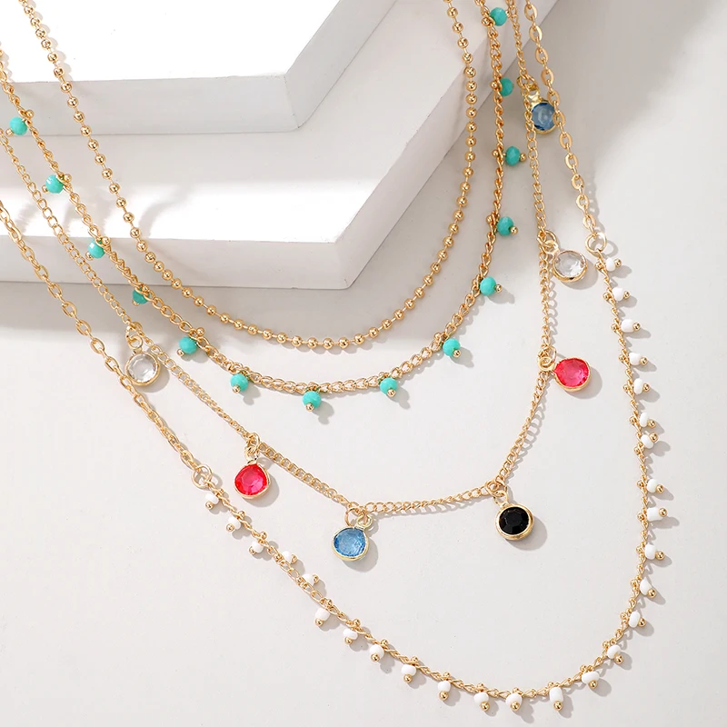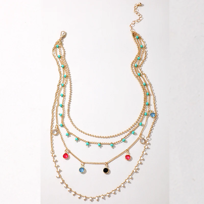 Fleepmart Baru Gaya Bohemia Berwarna-warni Manik-manik Kristal Rumbai Kalung Trendi Multilayer Logam Rantai Baju untuk Wanita Perhiasan