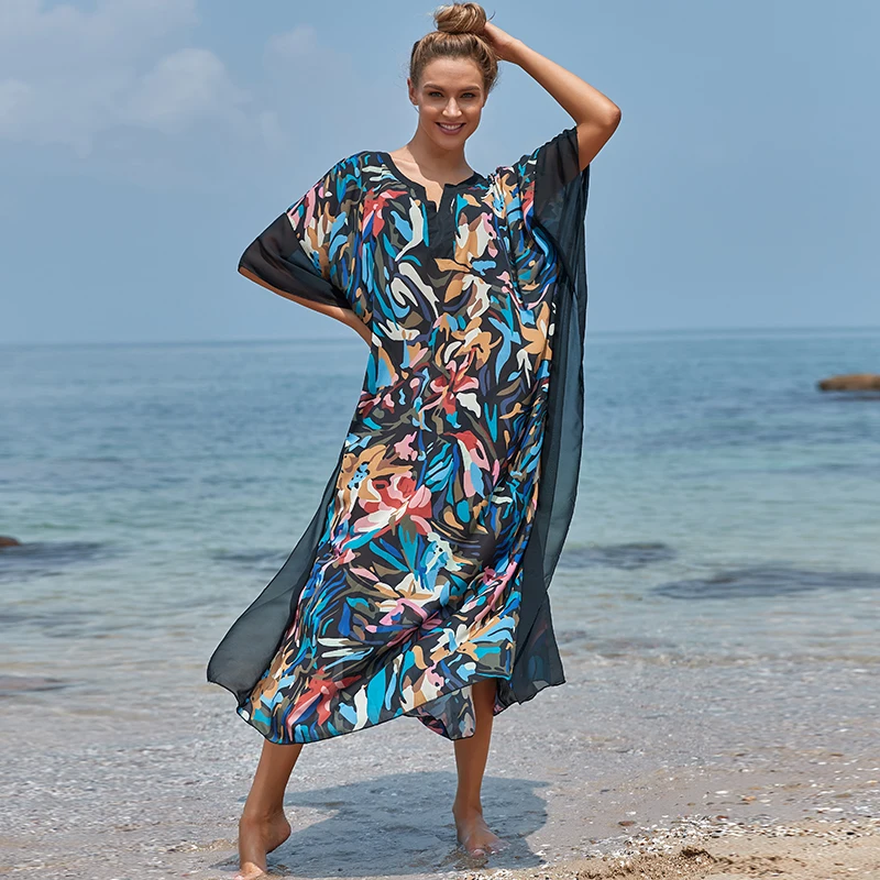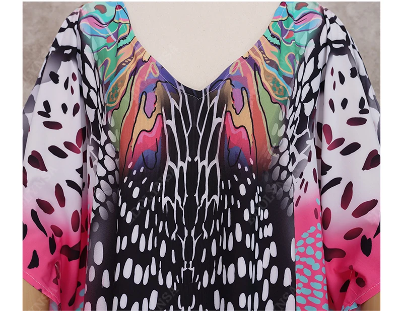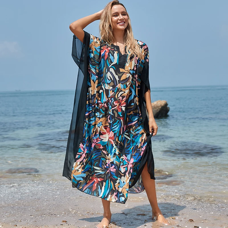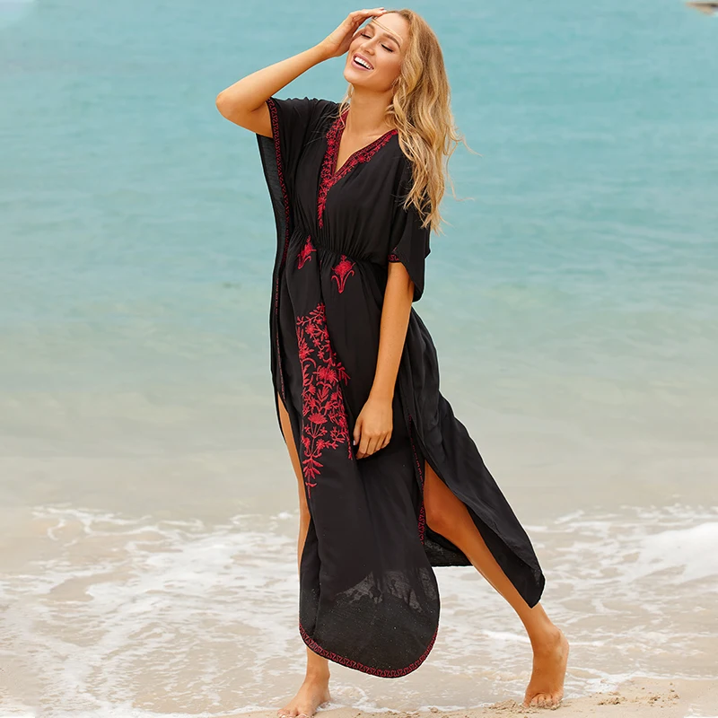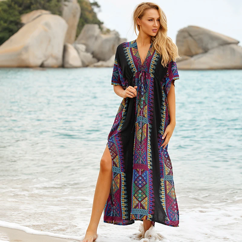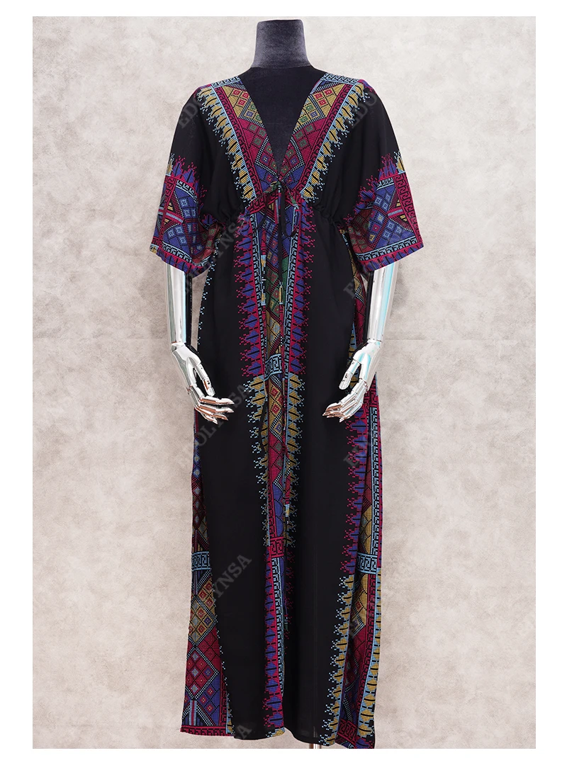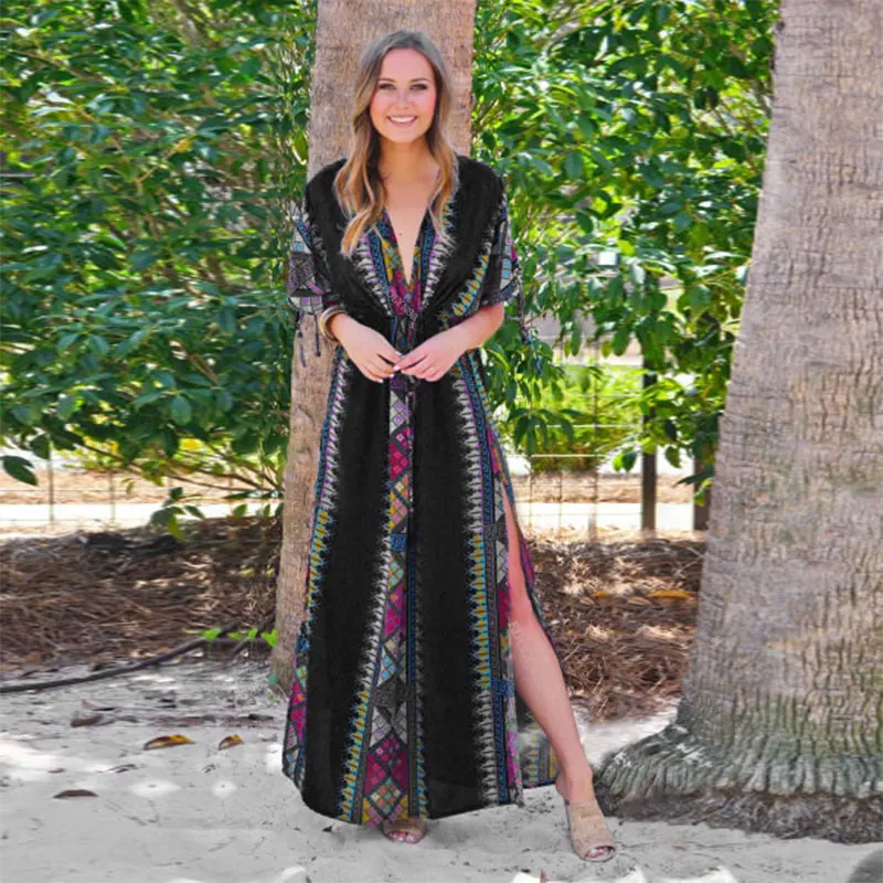 Fleepmart Black Indie Folk Turkey Kaftan Beach Dress Sexy V-Back Plunging Neck Half Sleeve Side Split Plus Size Women Summer Dress