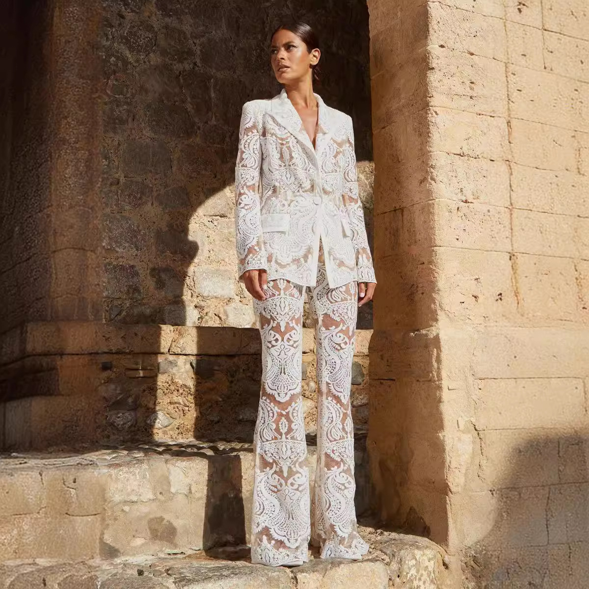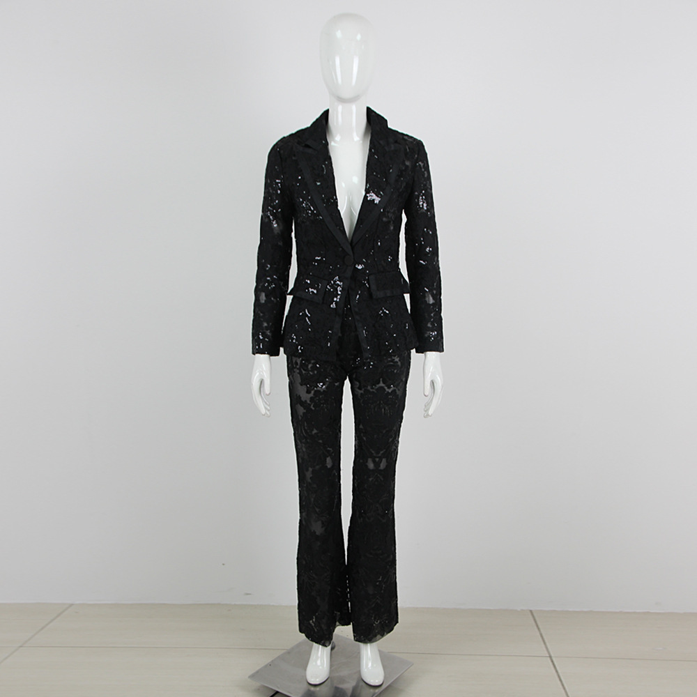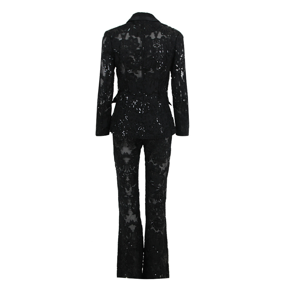 Fleepmart Black Lace Mesh Embroidered Sequin Pant Sets White New Designer Sequins Blazer Pants Set 2 Pieces Pants Suits Punk Suit Outfis