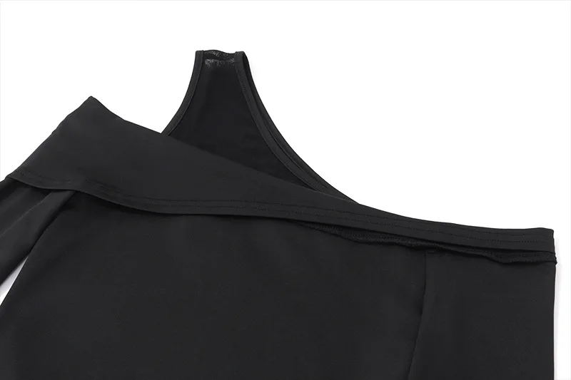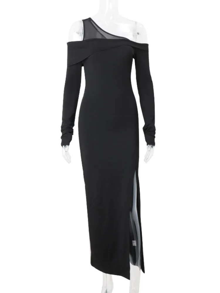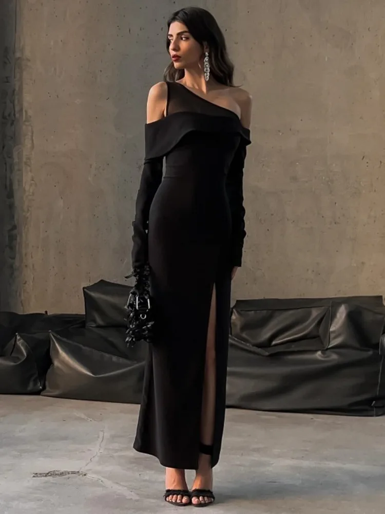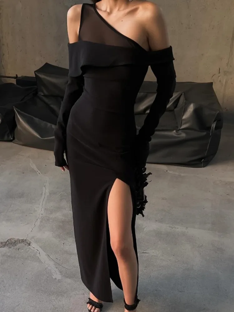 Fleepmart Black Oblique Shoulder Split Maxi Dress for Women Gown Solid Backless Long Sleeve Bodycon Sexy Evening Long Dress