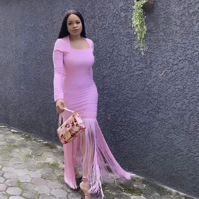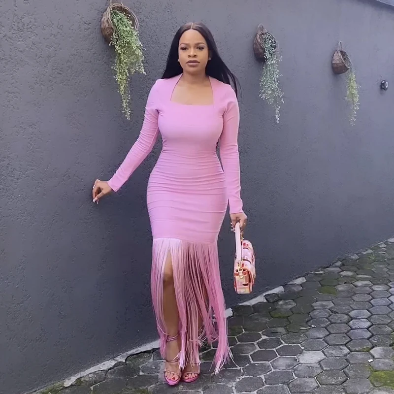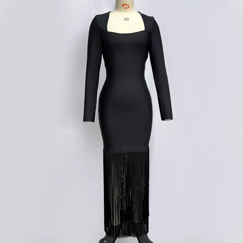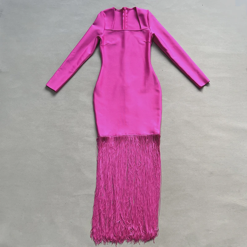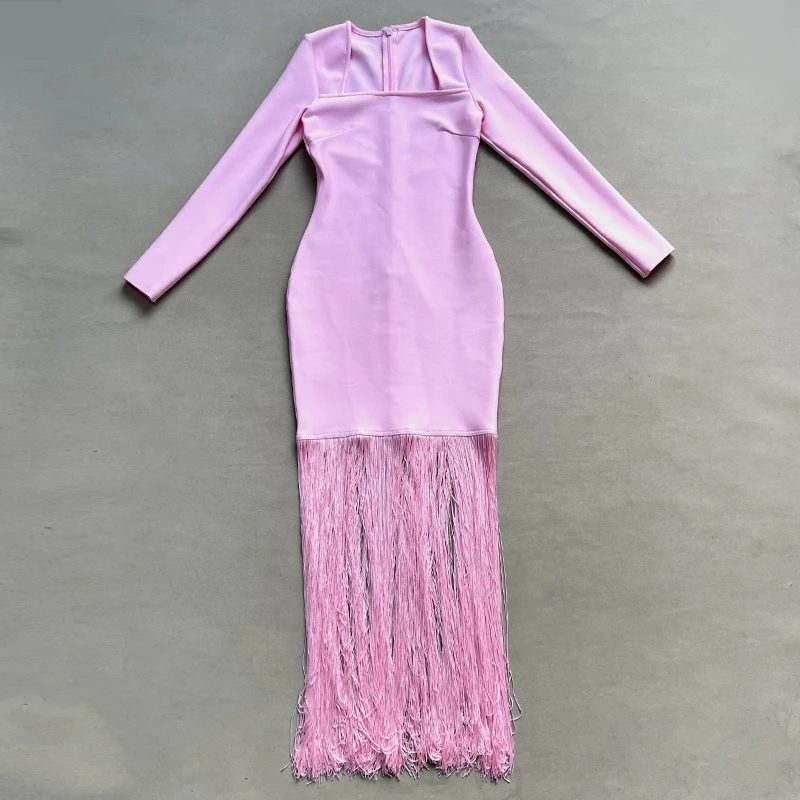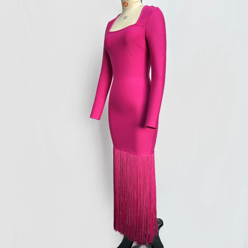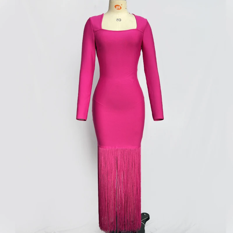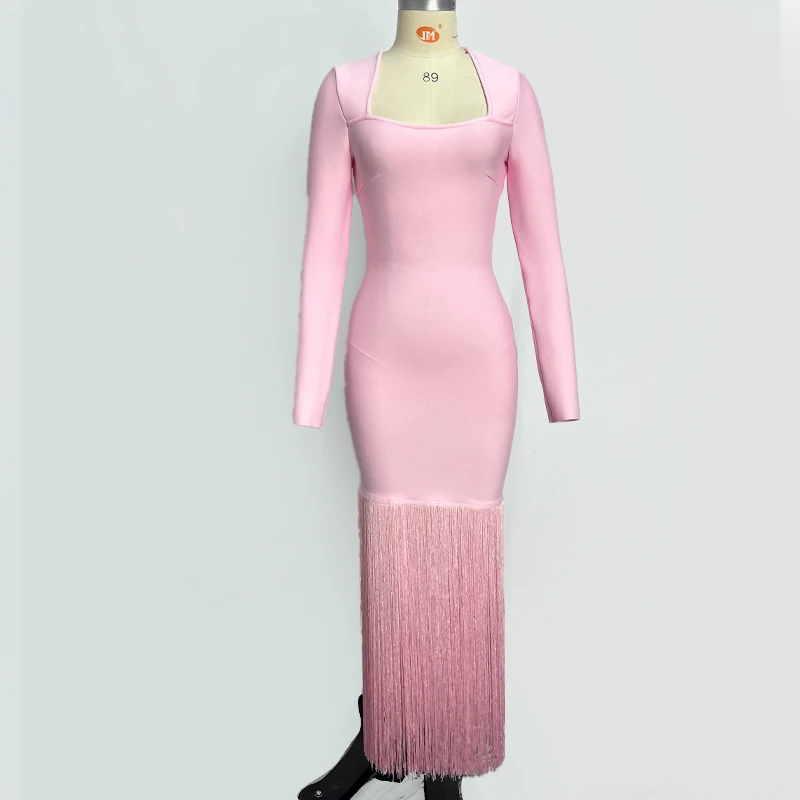 Fleepmart Black Rosered Pink Women Long Sleeve Sexy Square Collar Tassels Bodycon Bandage Long Dress Nightclub Party Celebrate Dress