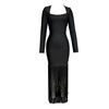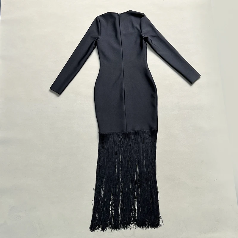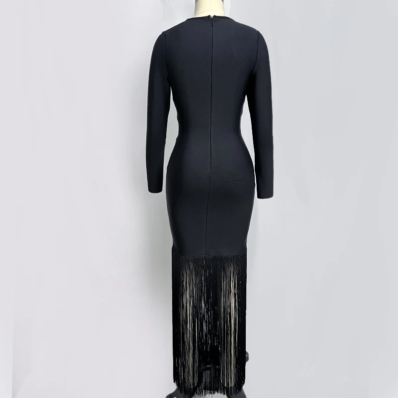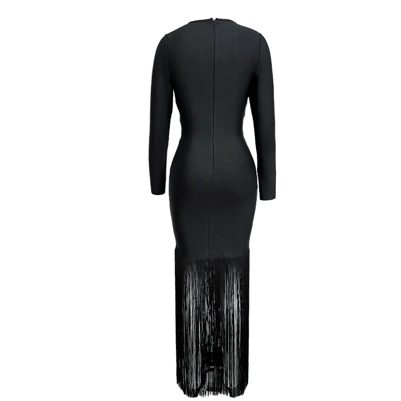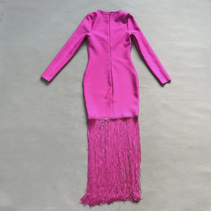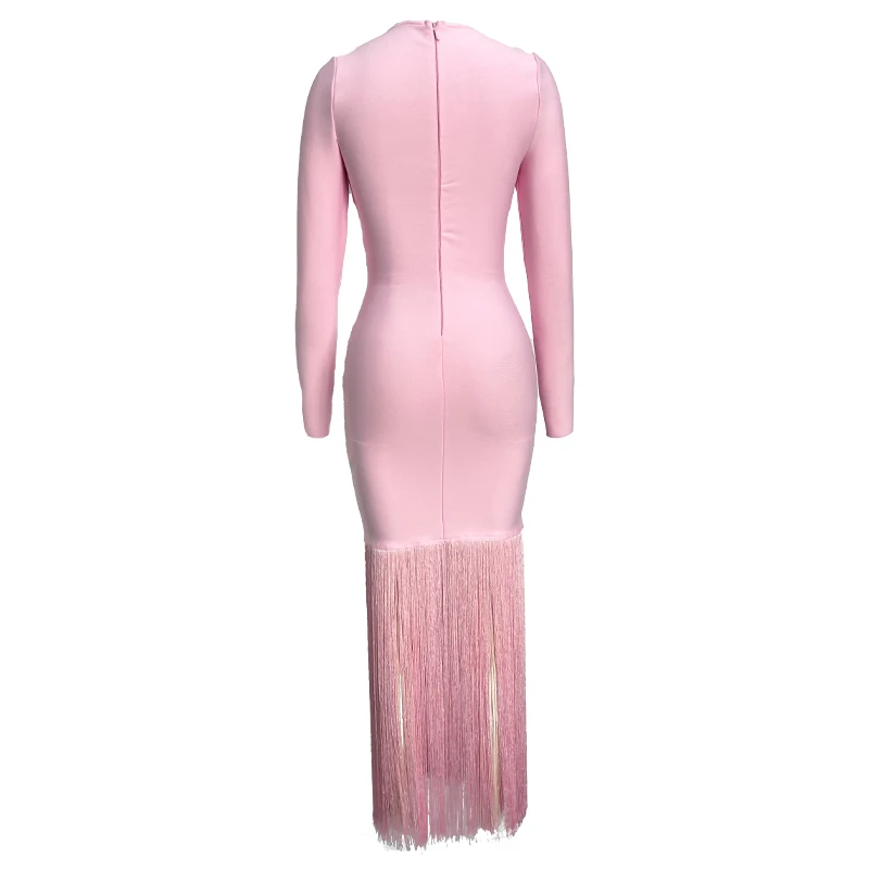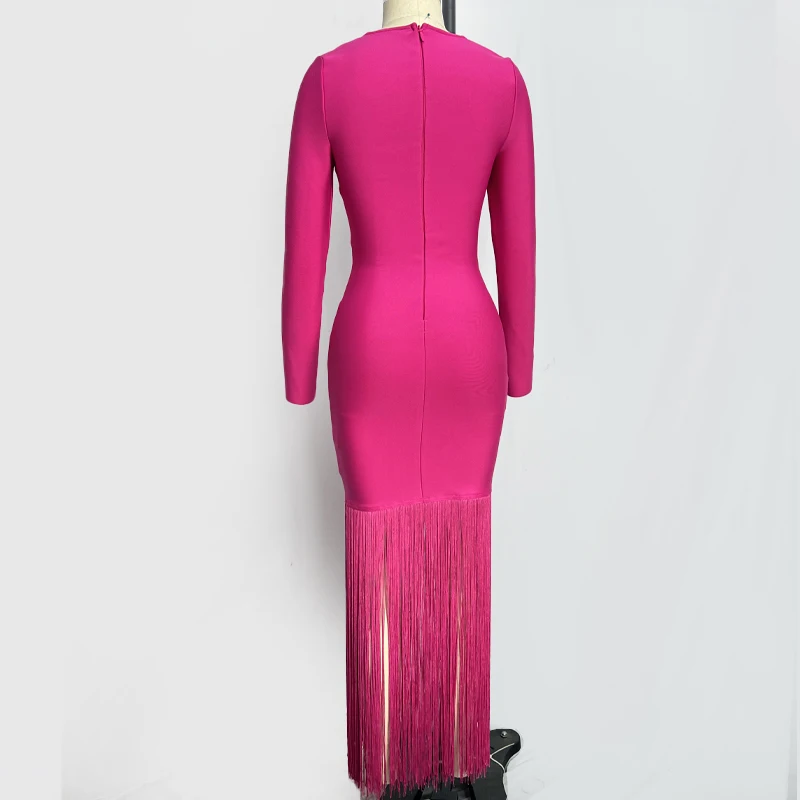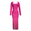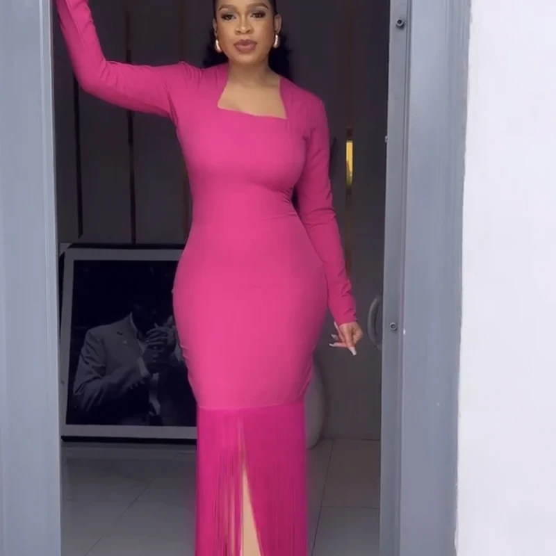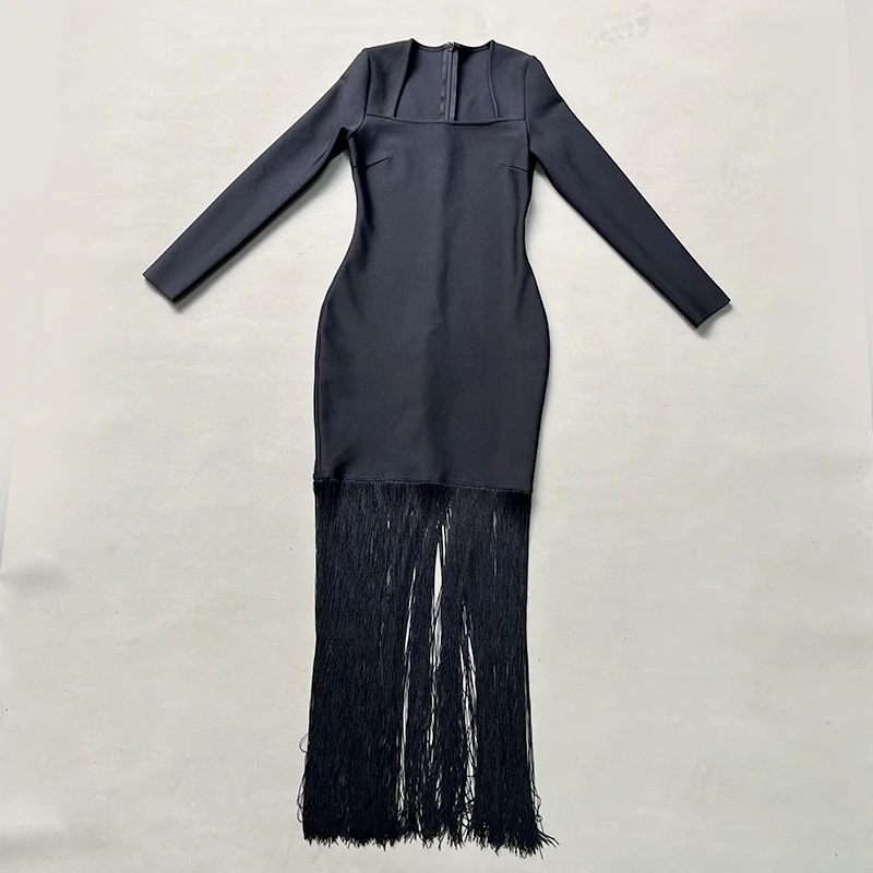 Fleepmart Black Rosered Pink Women Long Sleeve Sexy Square Collar Tassels Bodycon Bandage Long Dress Nightclub Party Celebrate Dress