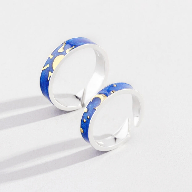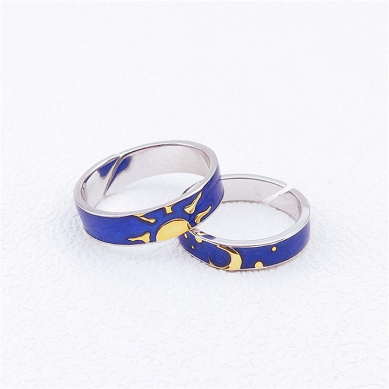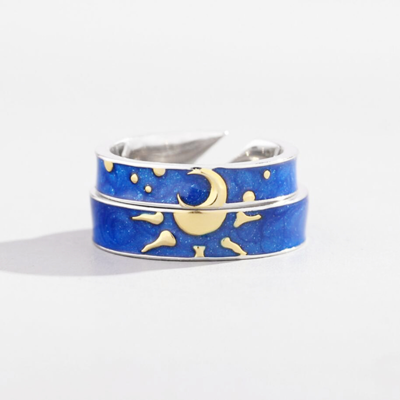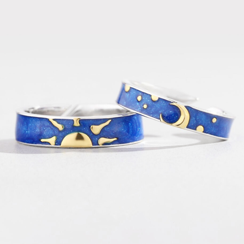Fleepmart Blue Drop Glaze Sun Moon Star Couple Sweet Romantic 925 Sterling Silver Female Resizable Opening Rings SRI407