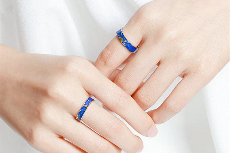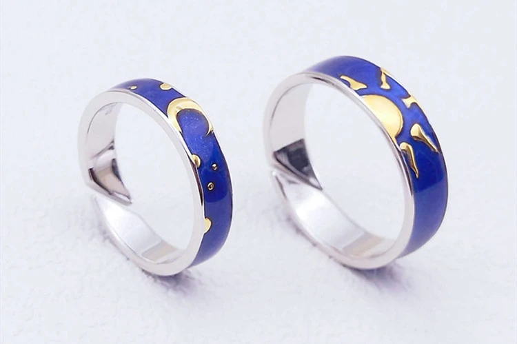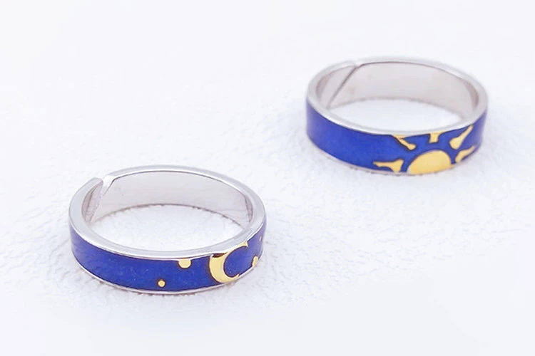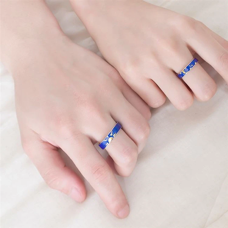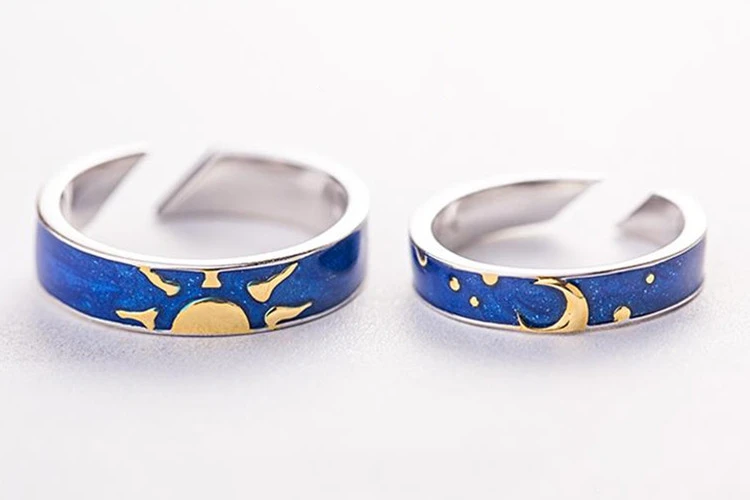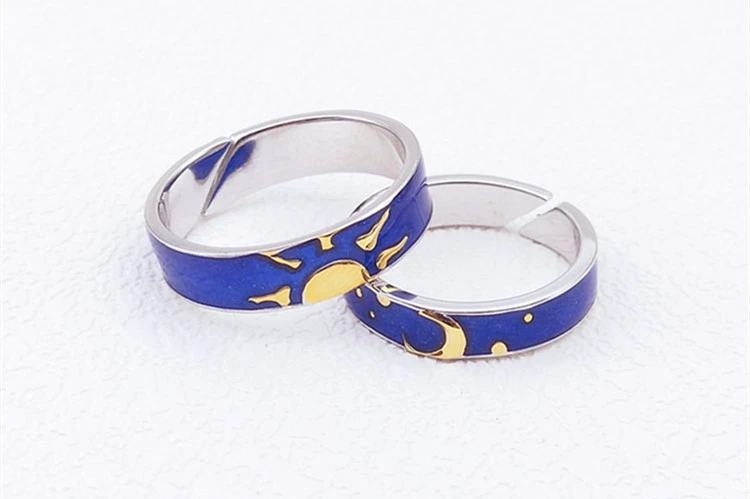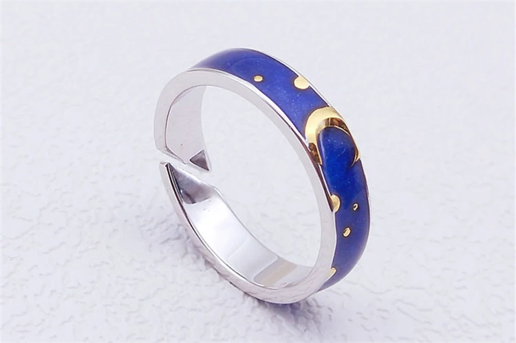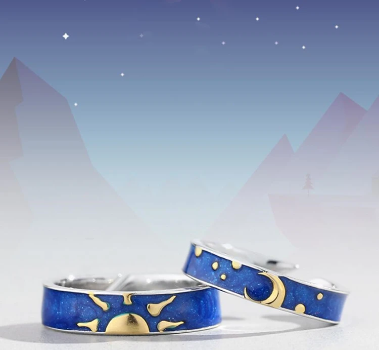 Fleepmart Blue Drop Glaze Sun Moon Star Couple Sweet Romantic 925 Sterling Silver Female Resizable Opening Rings SRI407