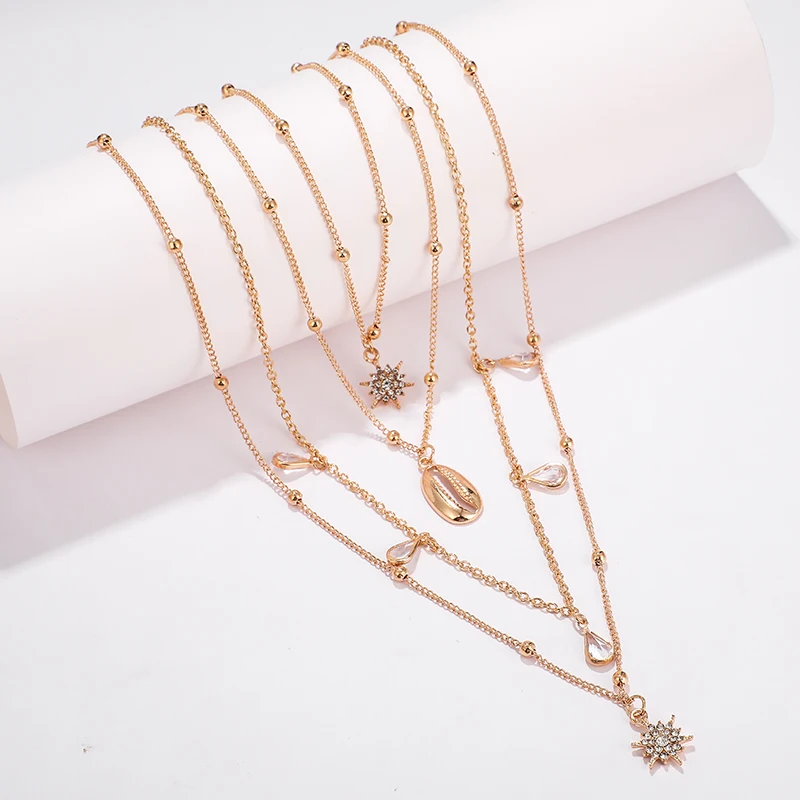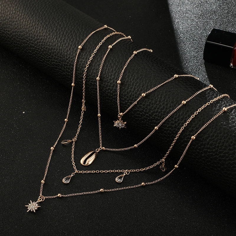 Fleepmart Boemian Layered Necklace Water Drop Crystal Stone Pendant Shiny Sun Summer Shell Chockers Women Jewelry