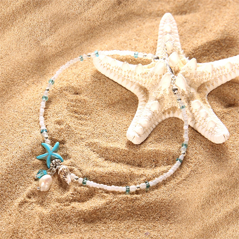 Fleepmart Bohemia Conch Starfish Beaded Anklet Imitation Pearl Pendant Foot Chain Women Girls Adjustable Accessories
