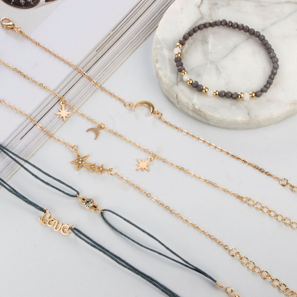 Fleepmart Bohemia Love Moon Bracelets for Women Charms Bead Gold Star Clear Crystal Stone Letter Rope Jewelry Accessories