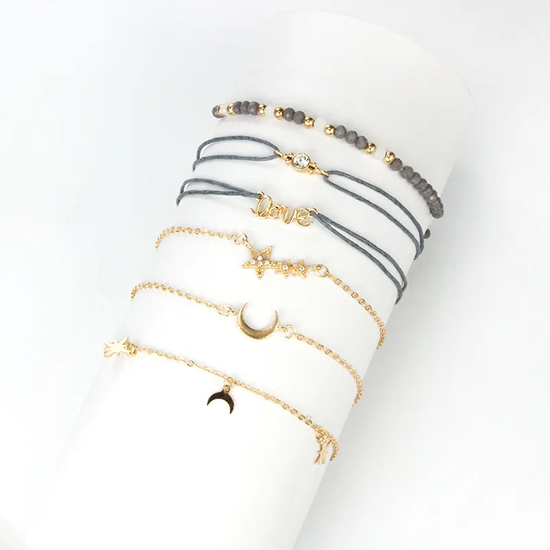 Fleepmart Bohemia Love Moon Bracelets for Women Charms Bead Gold Star Clear Crystal Stone Letter Rope Jewelry Accessories