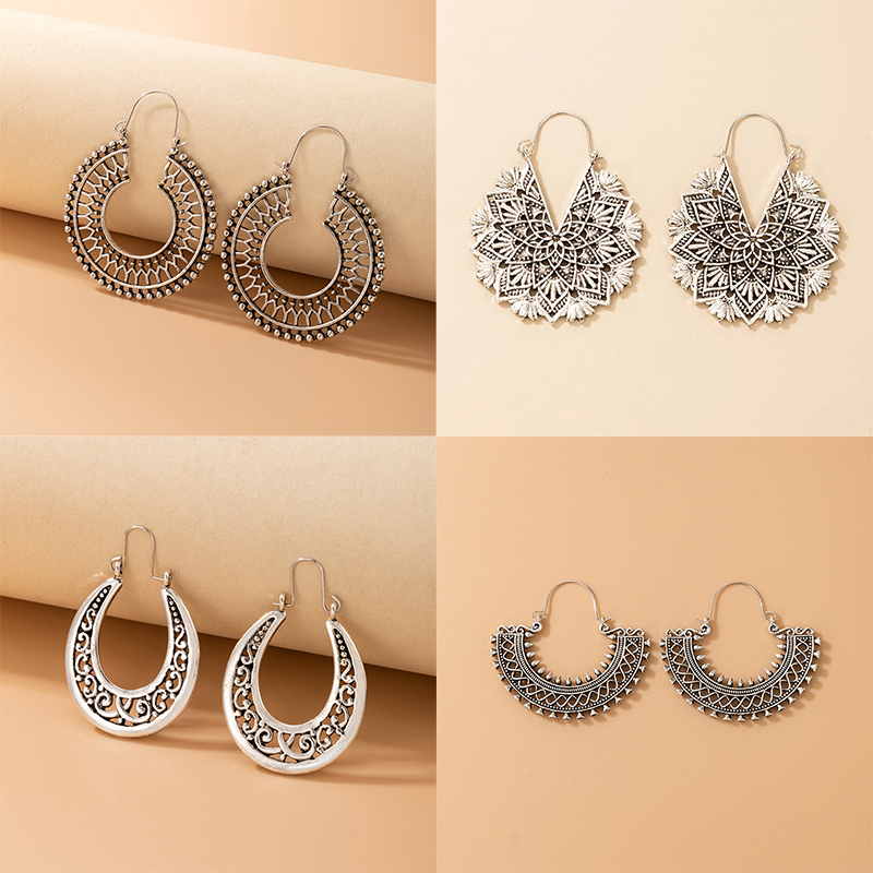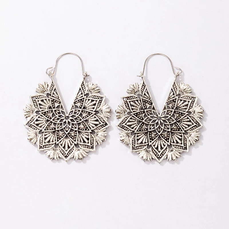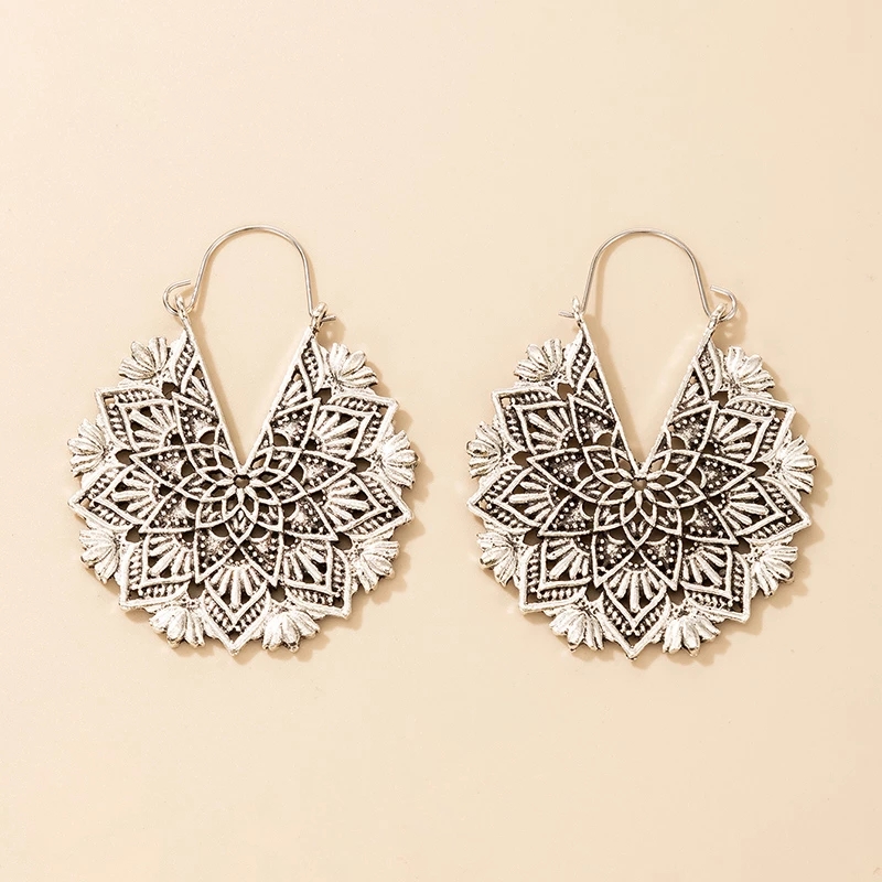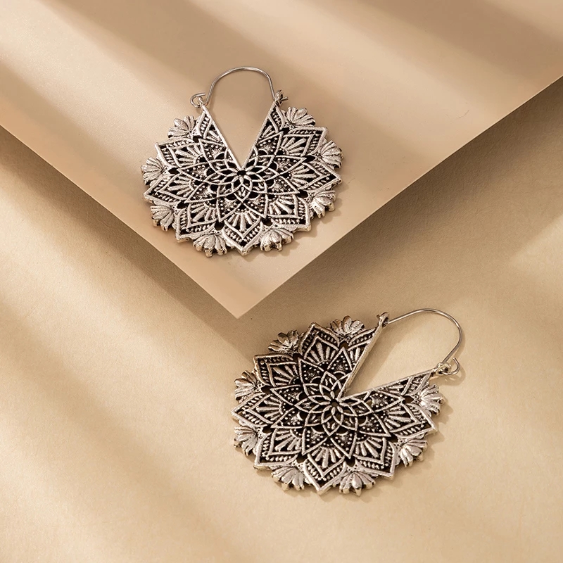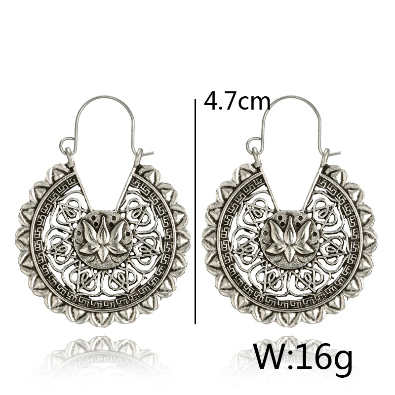Fleepmart Bohemia Tribal Hollow Lotus Flower Drop Earrings for Women Vintage Antique Carved Circle Dangle Earring Pendientes