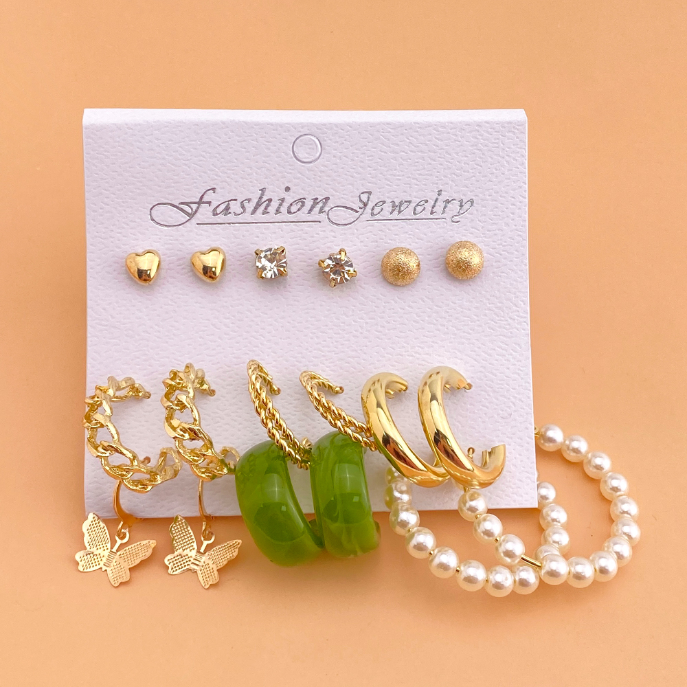 Fleepmart Bohemian Acrylic Metal Pearl Earring Set Retro Green Acrylic Circle Metal Chain Pendant Earring Trend Set Women Jewelry