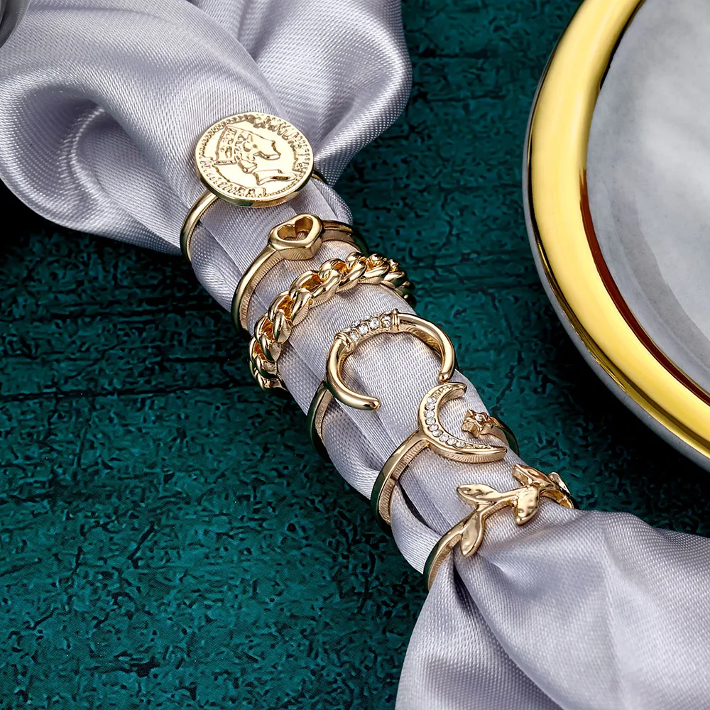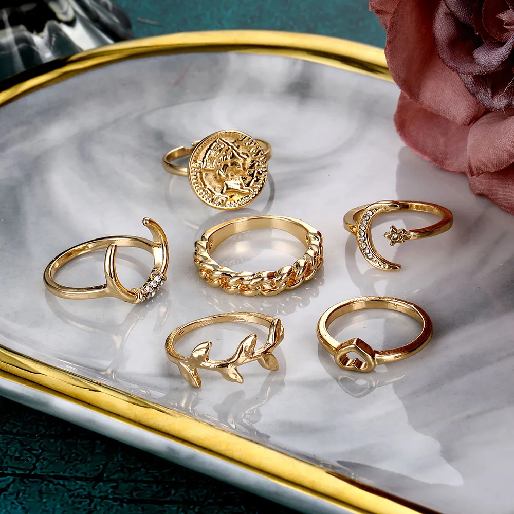 Fleepmart Bohemian Crescent Coin Crystal Knuckle Ring for Women Vintage Geometric Love Leaf Finger Ring Jewelry Party Gift