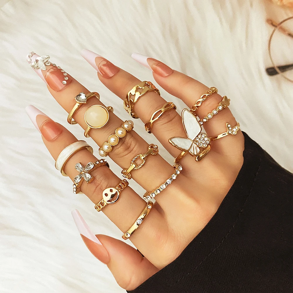 Fleepmart Bohemian Gold Geometric Joint Ring Set for Women Vintage Metal Chain Pearl Crystal Finger Ring Boho Jewelry Party Gift