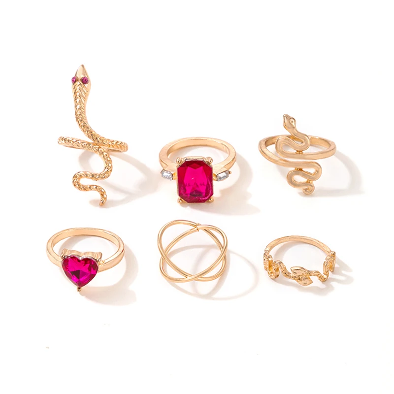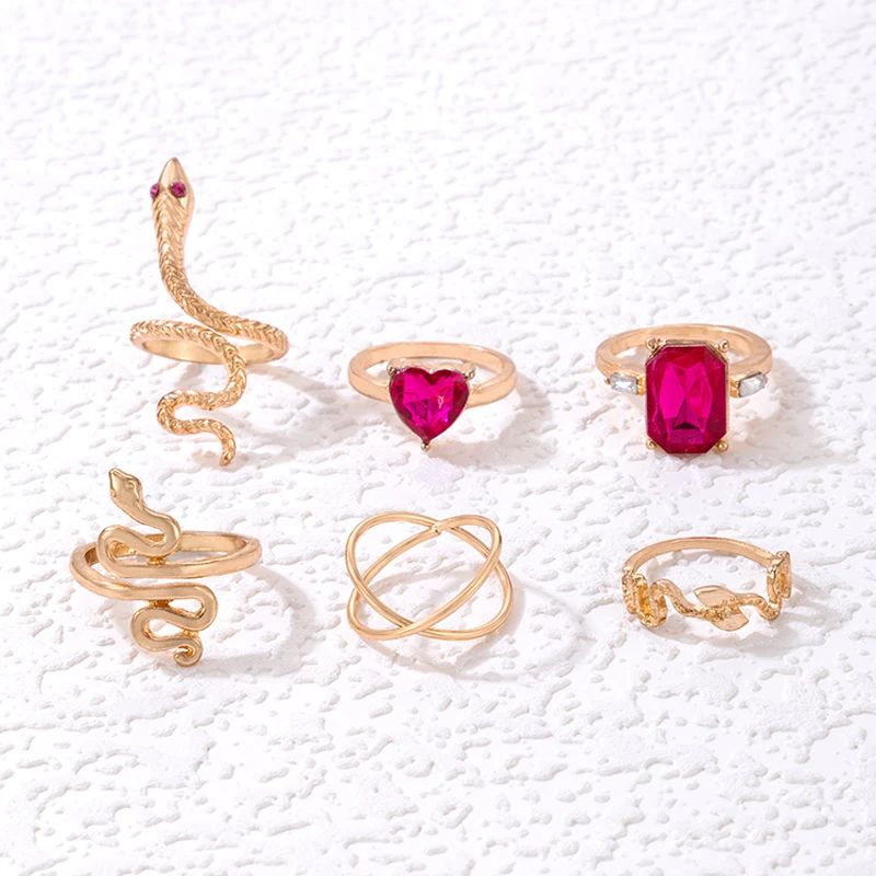 Fleepmart Bohemian Snake Joint Ring Sets for Women Lovely Pink Heart Crystal Stone Cross Geoemtry Jewelry Anillo 6pcs/sets
