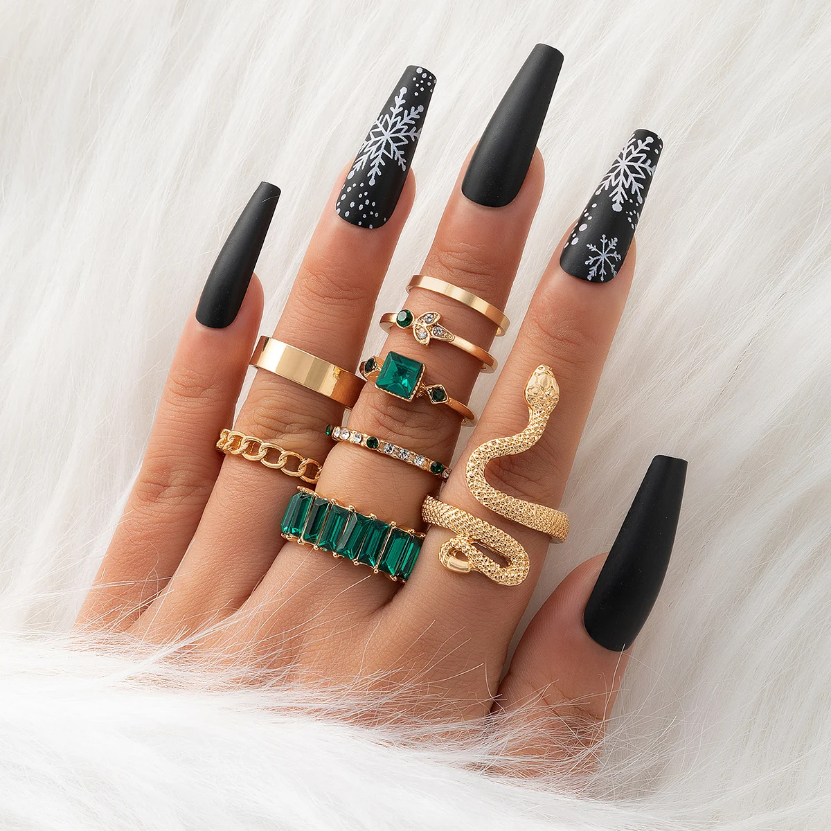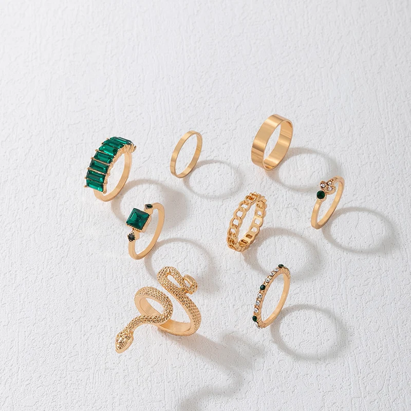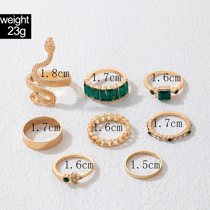 Fleepmart Bohemian Snake Joint Ring Sets Luxury Green Crystal Stone Leaf Geometry for Women Men Jewelry 8pcs/sets