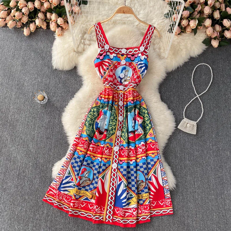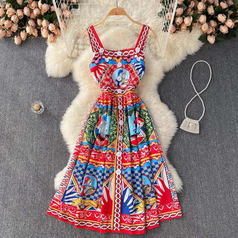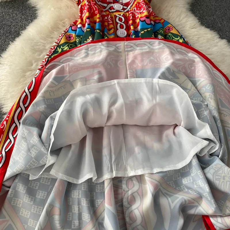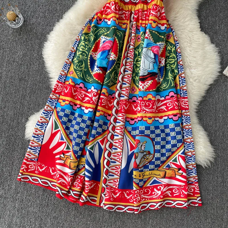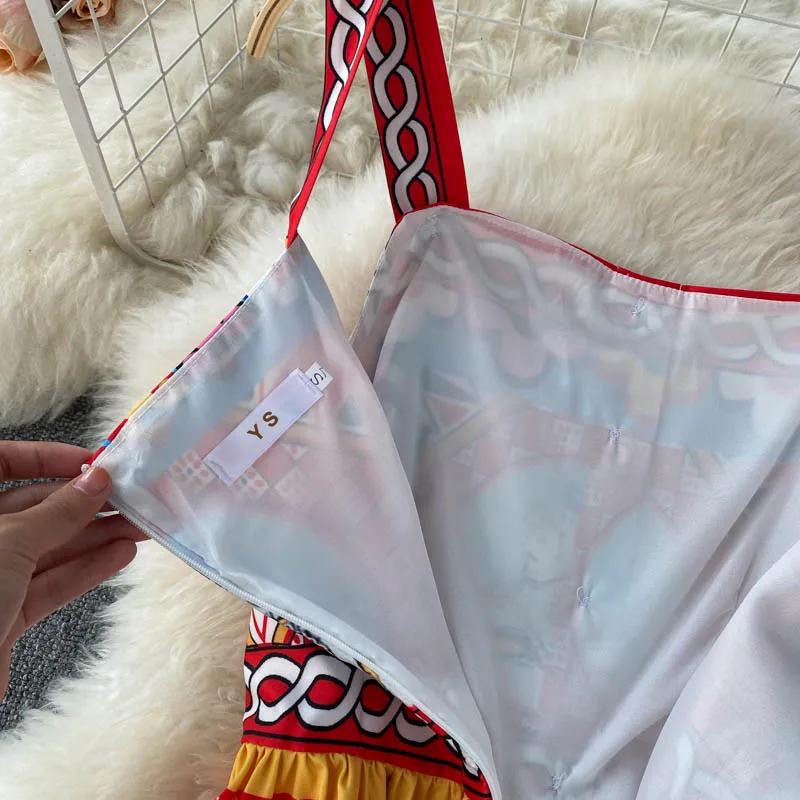 Fleepmart Bohemian Summer Women Spaghetti Strap Dress 2024Runway Fahsion Flower Print Bow Long Beach Party Vacation Camisole