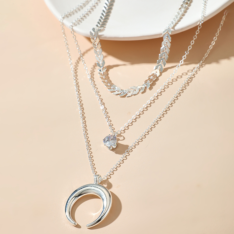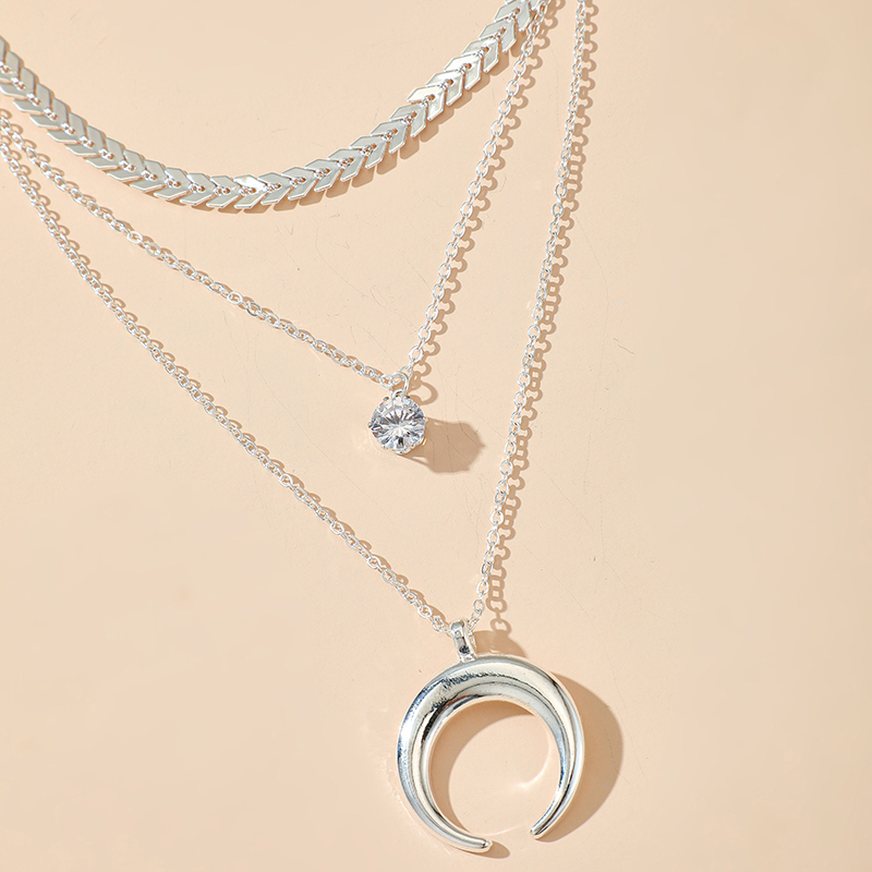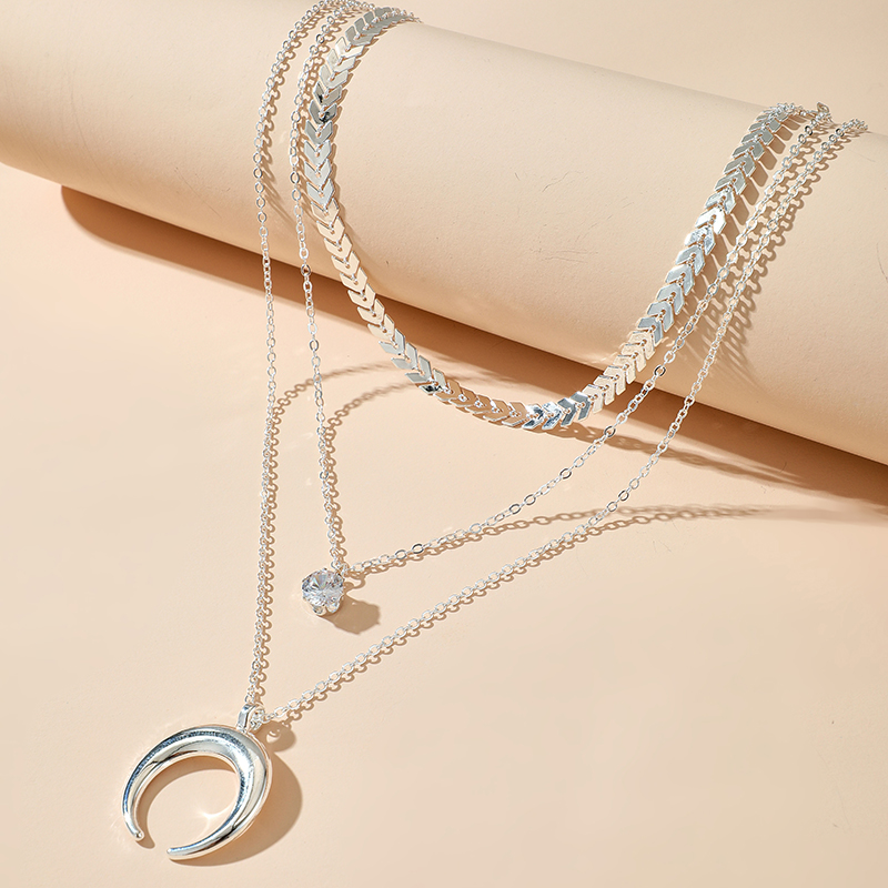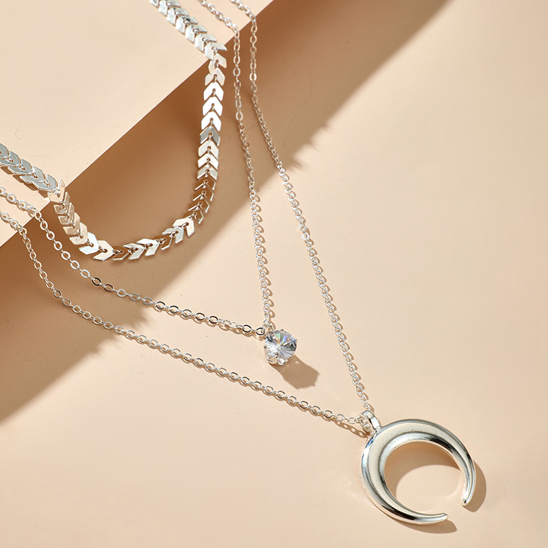 Fleepmart Boho Moon Pendant Necklace for Women Silver Color Clear Crystal Stone Leaf Chain Chocker Multi-layer Jewelry
