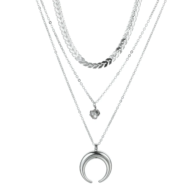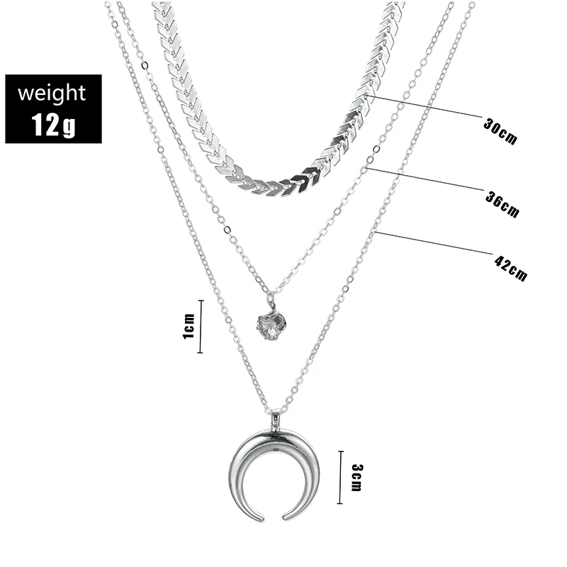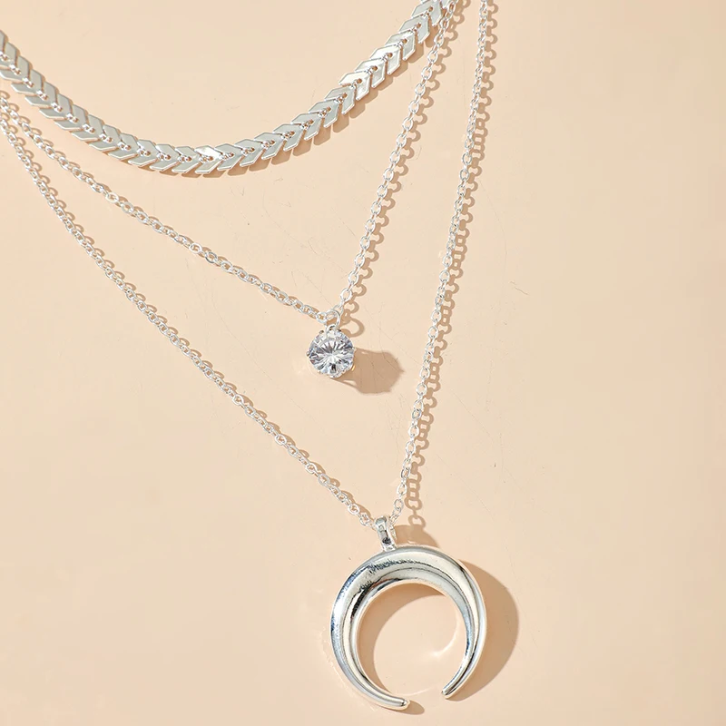 Fleepmart Boho Moon Pendant Necklace for Women Silver Color Clear Crystal Stone Leaf Chain Chocker Multi-layer Jewelry