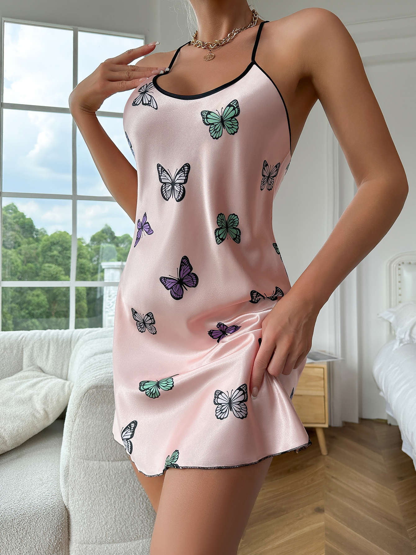Fleepmart Butterfly Print Nightdress Sexy Scoop Neck Backless Spaghetti Strap Sleep Dress Women’s Sleepwear Dresses