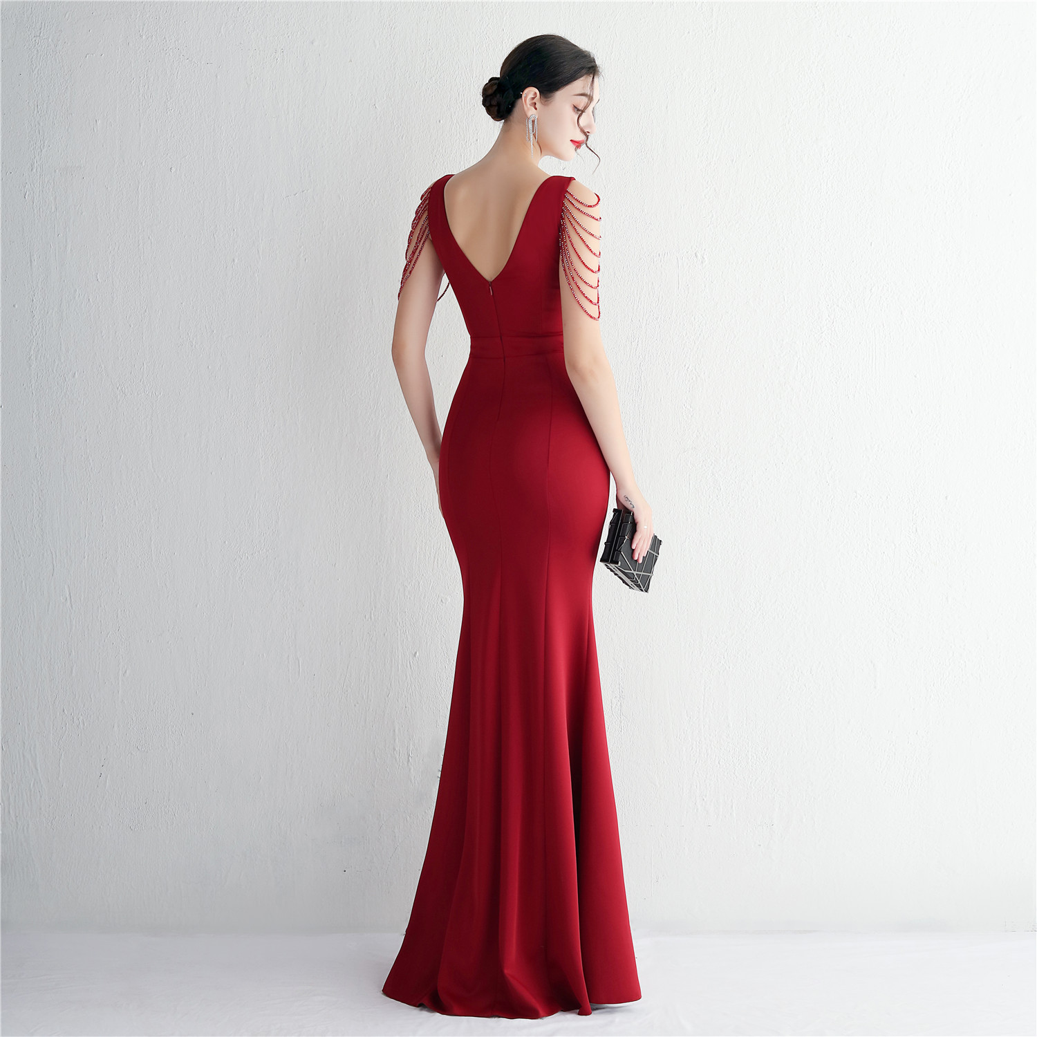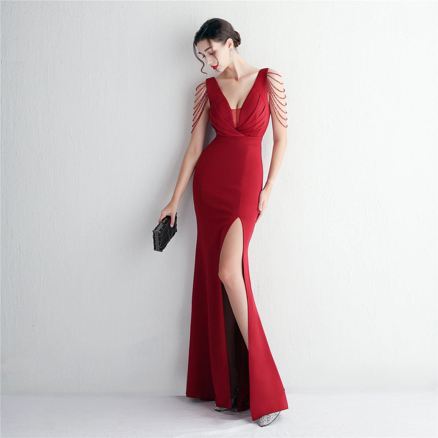Fleepmart Candy Color Women Beading Party Maxi Dress Navy Soft Satin Sexy V Neck Evening Dress Long Bridesmaid Drress