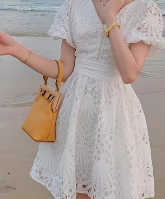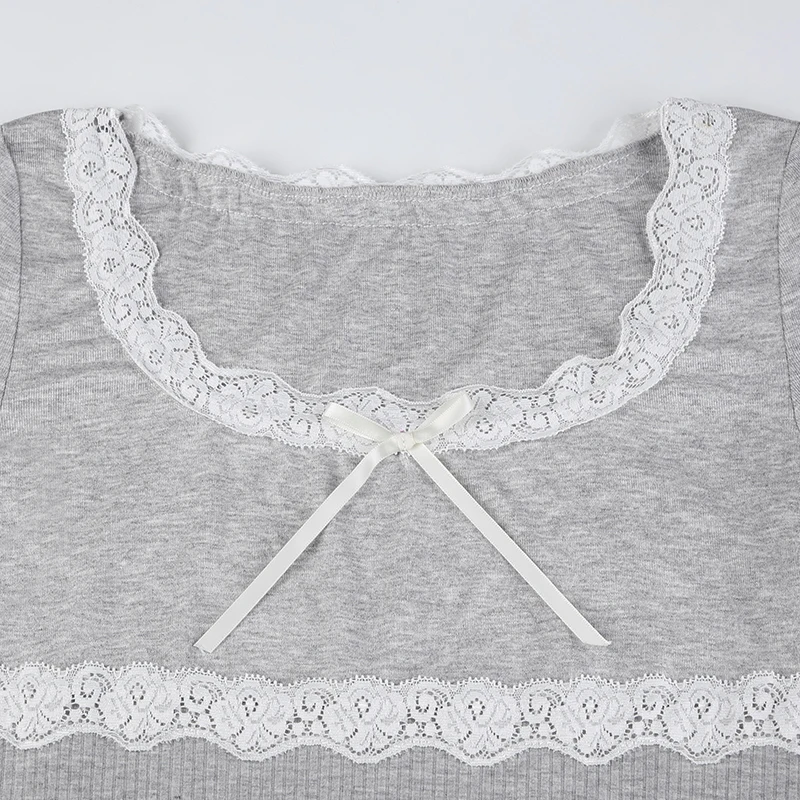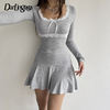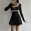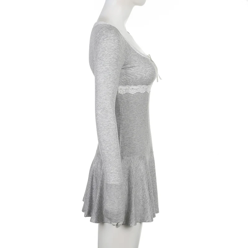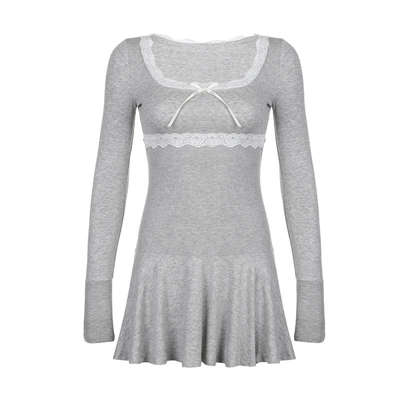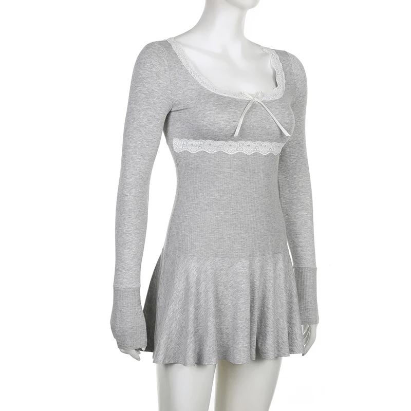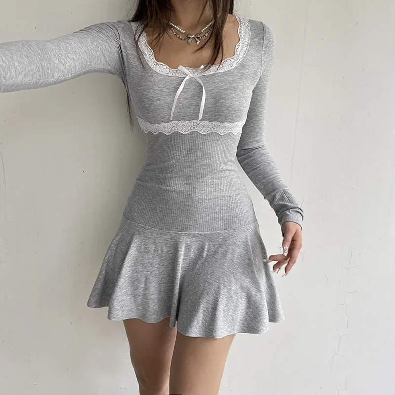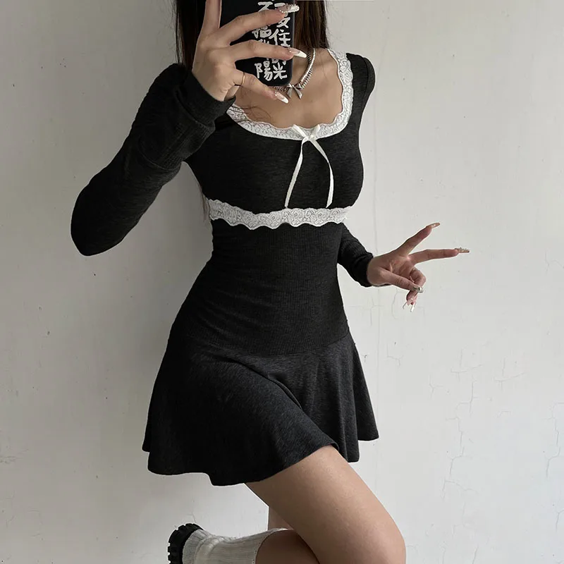 Fleepmart Casual Knit Sweet Bow Autumn Dress Basic Lace Patchwork Korean Coquette Clothes Square Neck A-Line Dress Women Retro