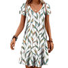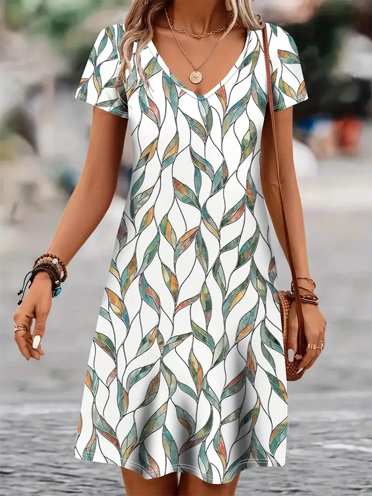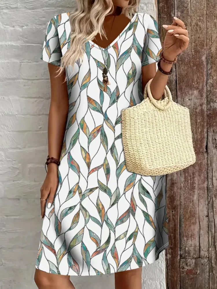 Fleepmart Casual Well-Fitted Printed Short Dress For Women Summer Elegant And Retro Lady’s V-Neck Short-Sleeved Straight Knee-Length Dress