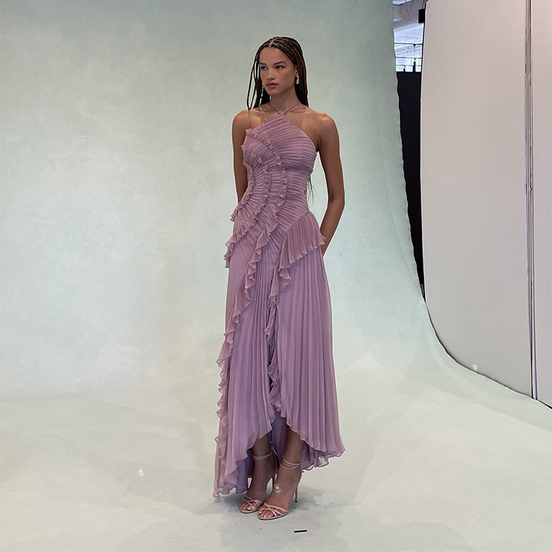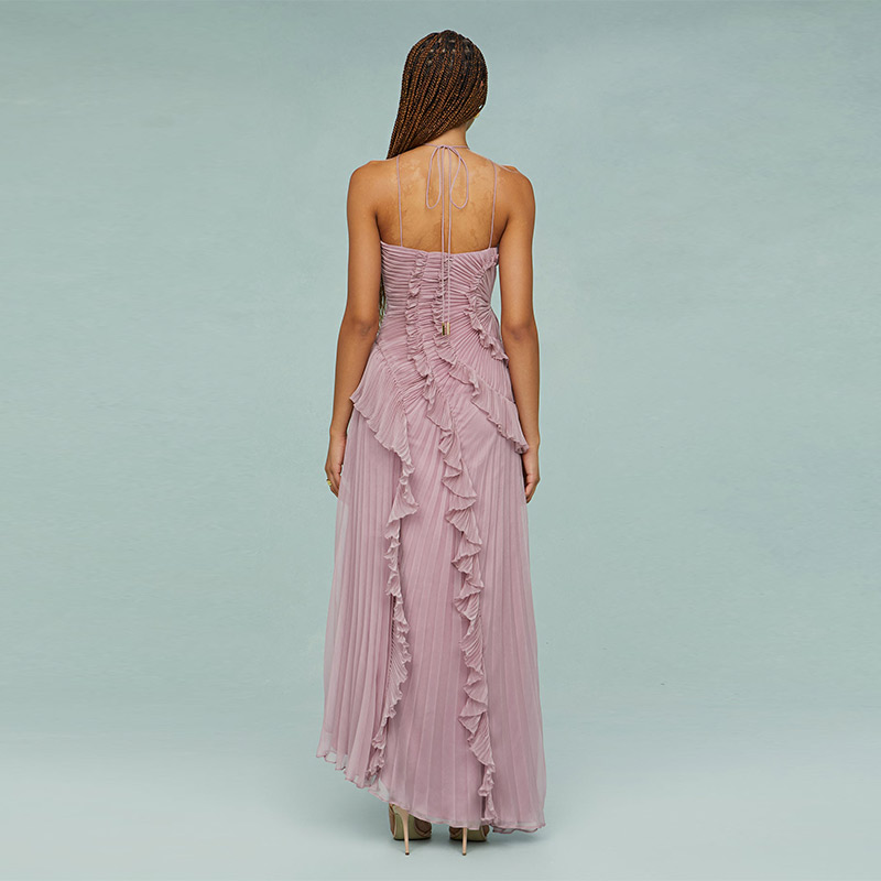 Fleepmart Chic Elegant Lotus Edge Maxi Dress Slim Fit Backless Lace Up Halter Robes Sleeveless Party Vestidos 2025 Nw Lady Vacation Gowns