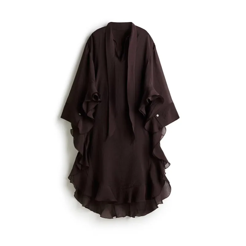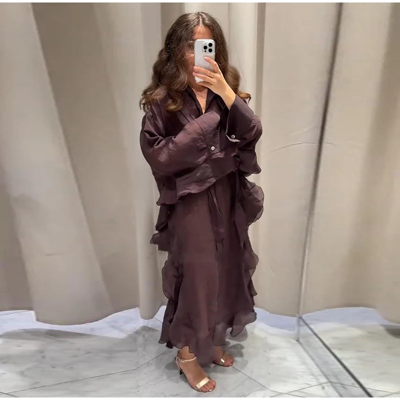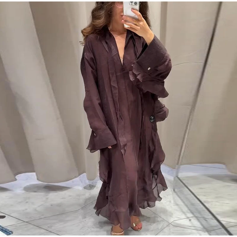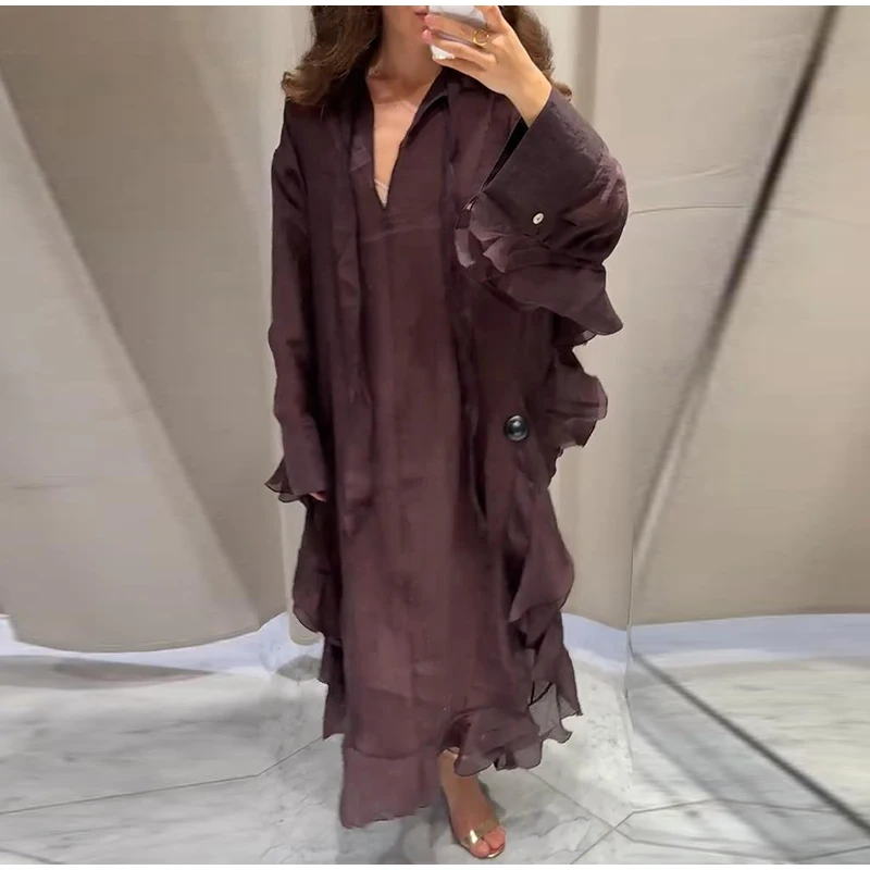 Fleepmart Chic Women’s Long Dress Elegant Loose Long Sleeve Maxi Dress Office Lady Vintage Summer V-neck Tierred Ruffles Robe