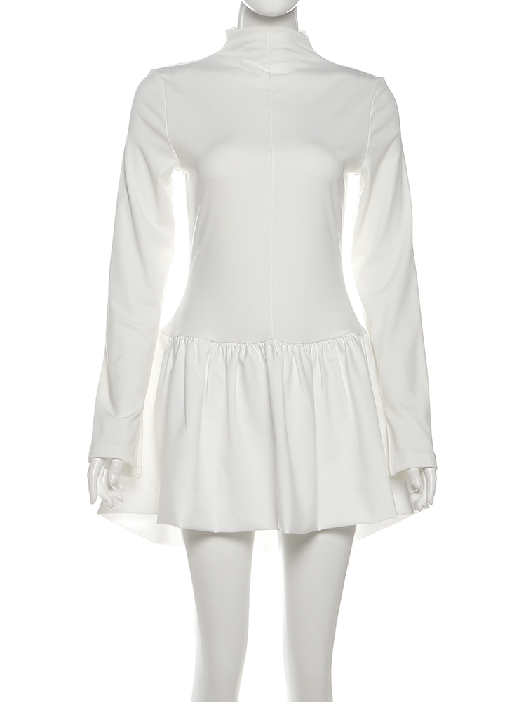 Fleepmart Classic Bubbles Hem Dress Women Turtleneck Simple Full Sleeve Solid Full Stretch Elegant Birthday Party Mini Bodycon